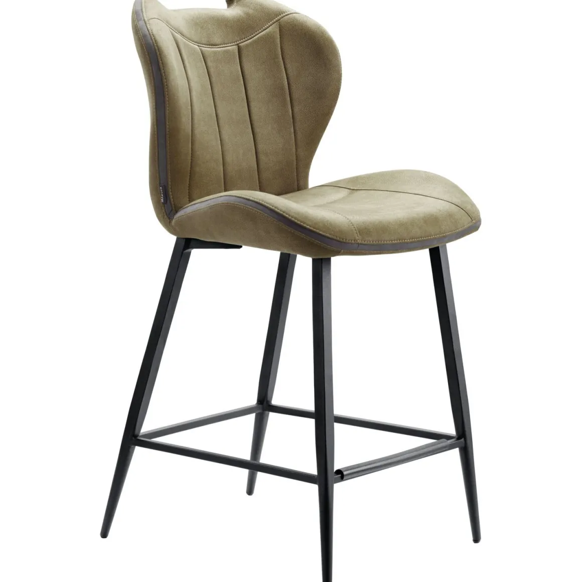 Barkruk Tantini heeft een stoere uitstraling door de groene kleur met bruine ondertoon. Dit is een microvezelstof die eruitziet als leder, maar heerlijk zacht aanvoelt. Het retrostiksel op de rug en zitting, en de band in een grijze stof accenturen de stoere belijning van deze barkruk.