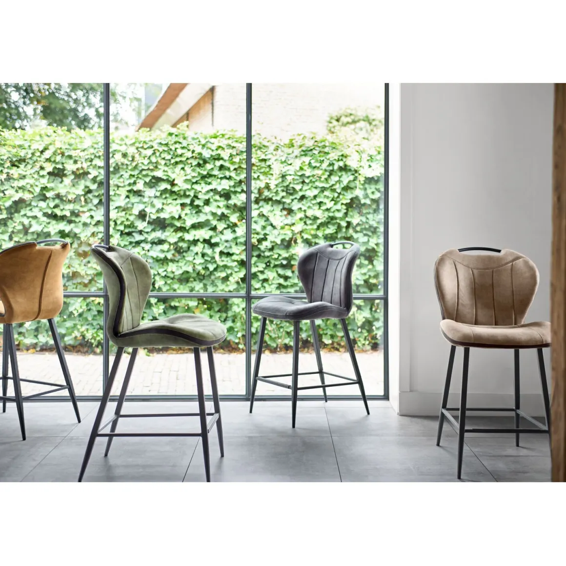 Barkruk Tantini heeft een stoere uitstraling door de lichtbruine kleur. Dit is een microvezelstof die eruitzie als leder, maar heerlijk zacht aanvoelt. Het retrostiksel op de rug en zitting, en de band in en grijze stof accenturen de stoere belijning van deze barkruk.