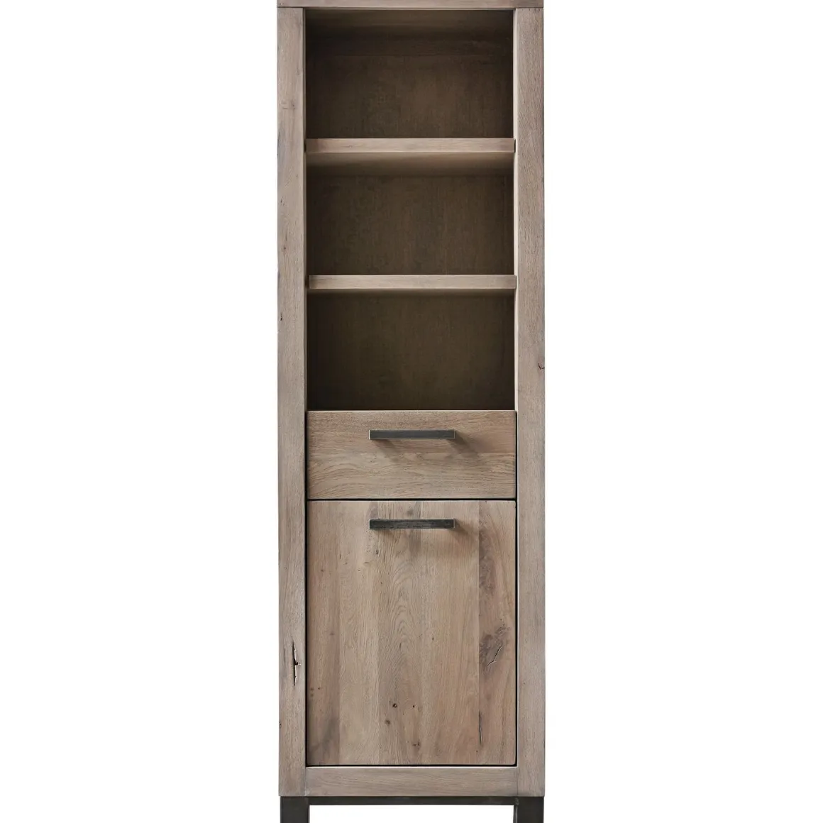 Deze robuuste boekenkast Hevano is gemaakt van eikenhout met een grof gelast stalen onderstel. Eikenhout kenmerkt zich door de fijne nerf, vlamtekening en de wisselende kleurschakering. Elke boom heeft een eigen uitstraling door de groei en weersinvloeden. Structuur, nerfschakering, windbarstjes, haarscheurtjes en de aanwezigheid van grote en kleine knoesten getuigen van jarenlange groei en maken het hout van de boom authentiek.