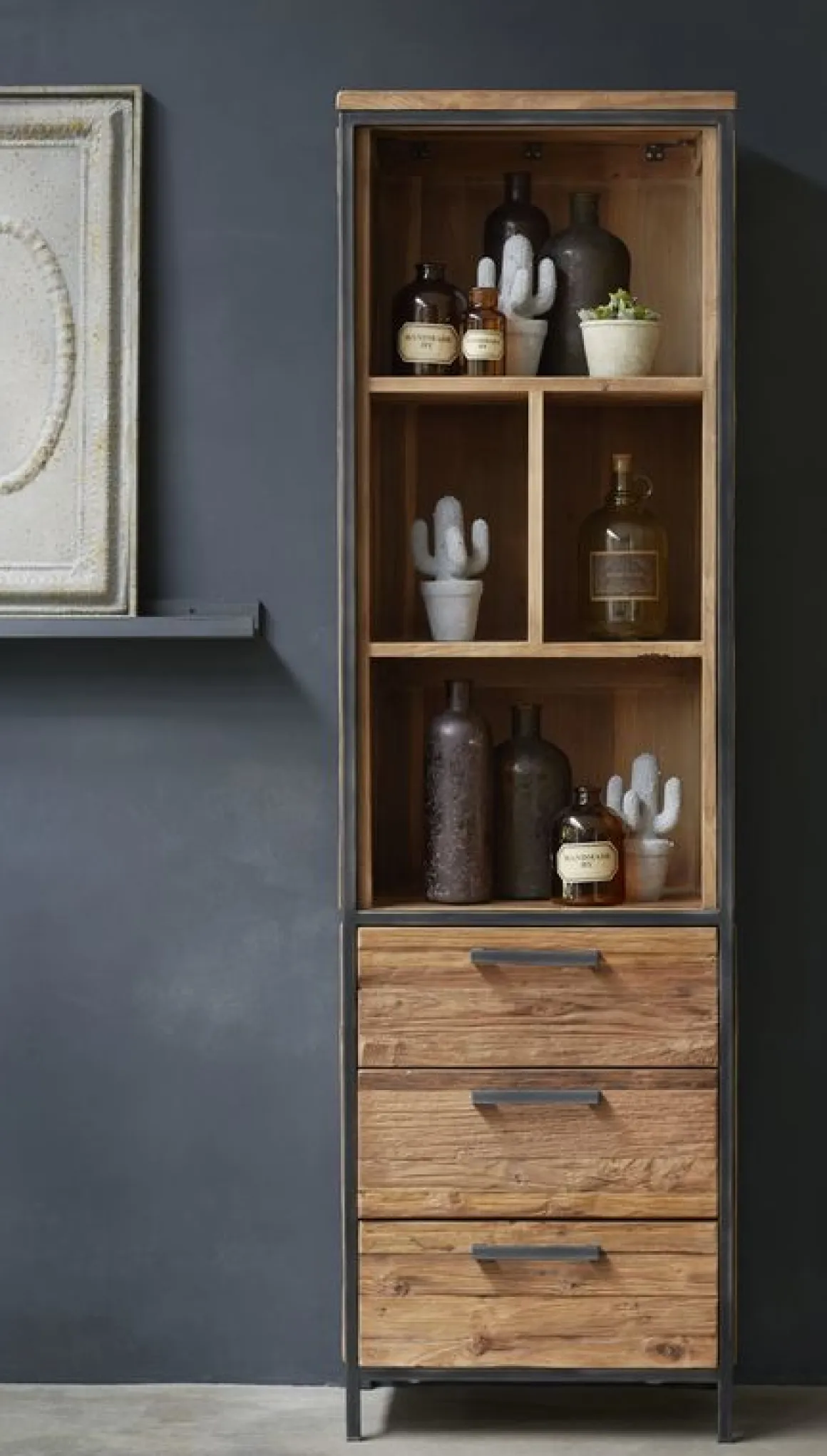 | Uitvoering | Uitgevoerd in teakhout mix rough, met 3 laden, 4 open vakken en metalen frame. |