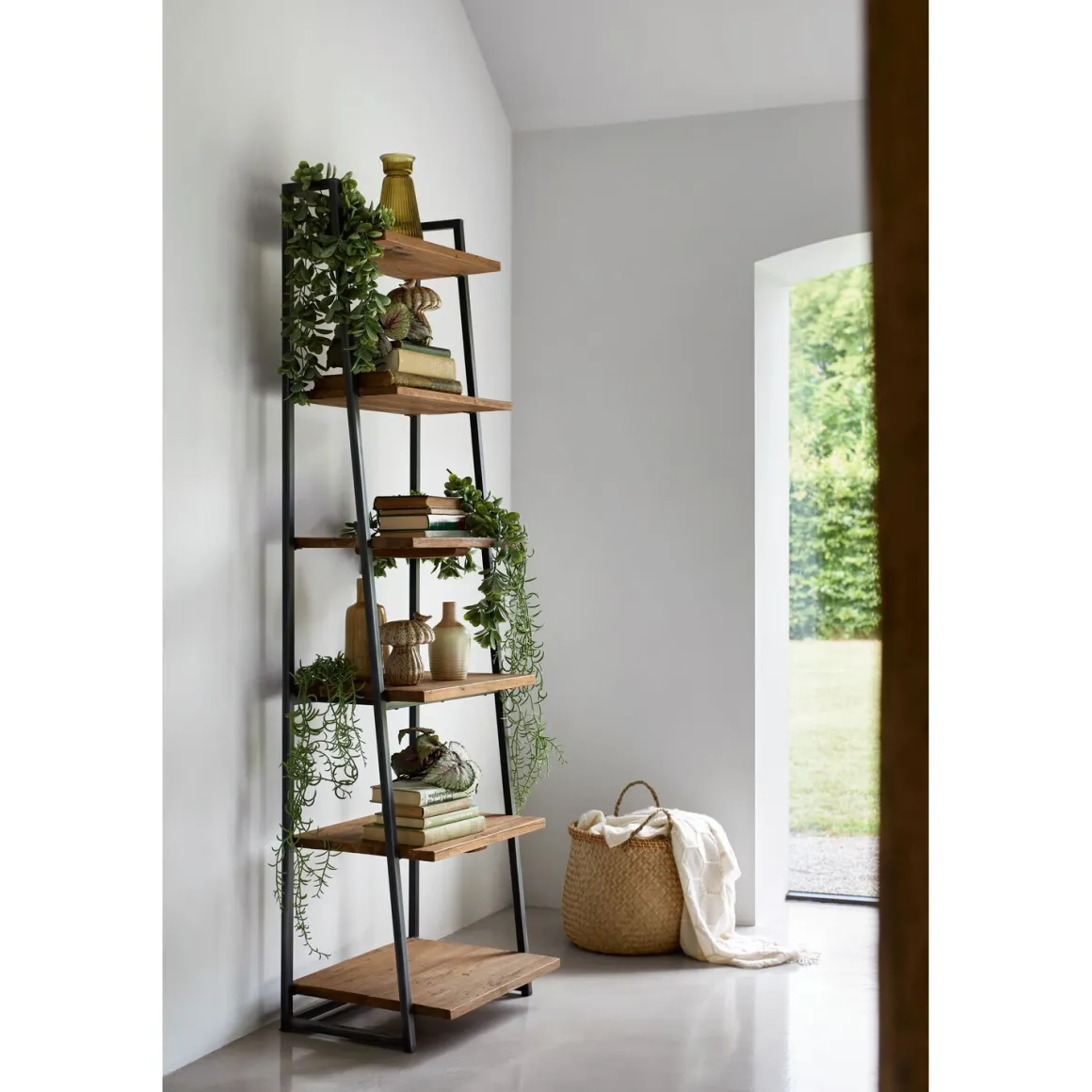 | Uitvoering | Staand, uitgevoerd met 6 legplanken in teakhout mix rough en metalen frame. |