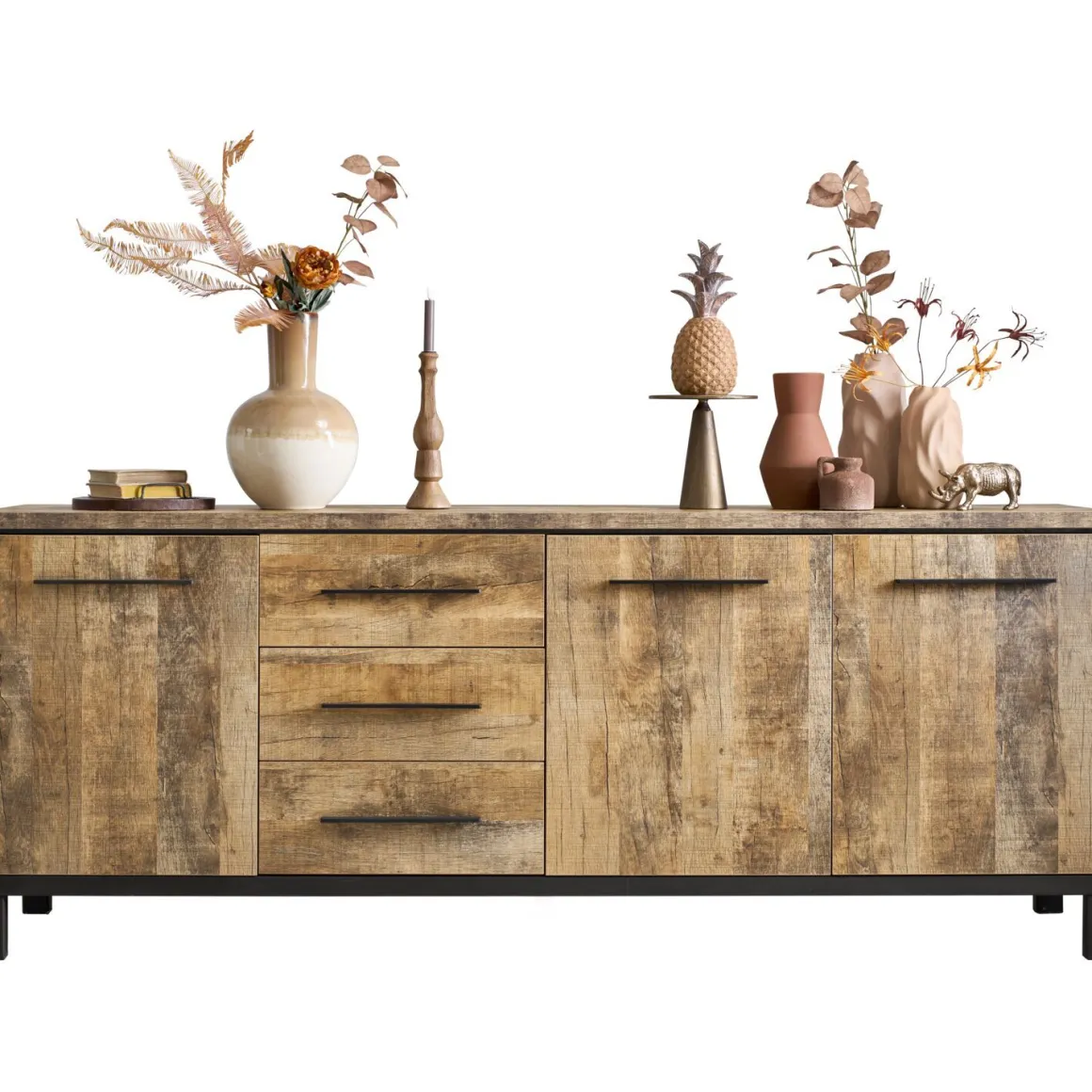 De combinatie van het zwart metalen frame en de kleur oriënt decor geeft het dressoir een robuust karakter. Het dressoir is uitgevoerd in Lamulux. Lamulux is een materiaalontwikkeling gebaseerd op houtvezelplaat en melamine en wordt bij onze meubelen gebruikt als toplaag. Het is sterk, hard en minder gevoelig voor krassen. Door de aangebrachte houttekening en -structuur, heeft het dezelfde karakteristieke kenmerken van massief hout. Het ziet er niet alleen uit als echt hout, het voelt ook nog eens zo!