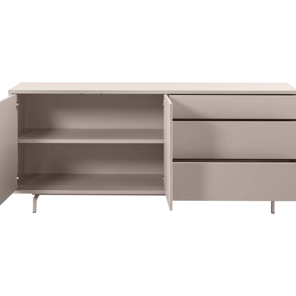 Met een hoogte van 76 cm, breedte van 180 cm en diepte van 45 cm is dit dressoir een praktische en stijlvolle toevoeging aan je interieur. Het heeft twee deuren en drie lades, elk met een legplank achter de deur. Dankzij het push to open systeem open je de lades en deuren eenvoudig met een lichte druk. De deuren zijn daarnaast voorzien van softclose, waardoor ze rustig openen en sluiten. Een klein duwtje bij het sluiten zorgt dat ze netjes dicht gaan. Het meubel wordt grotendeels gemonteerd geleverd; je hoeft alleen de poten nog te bevestigen.