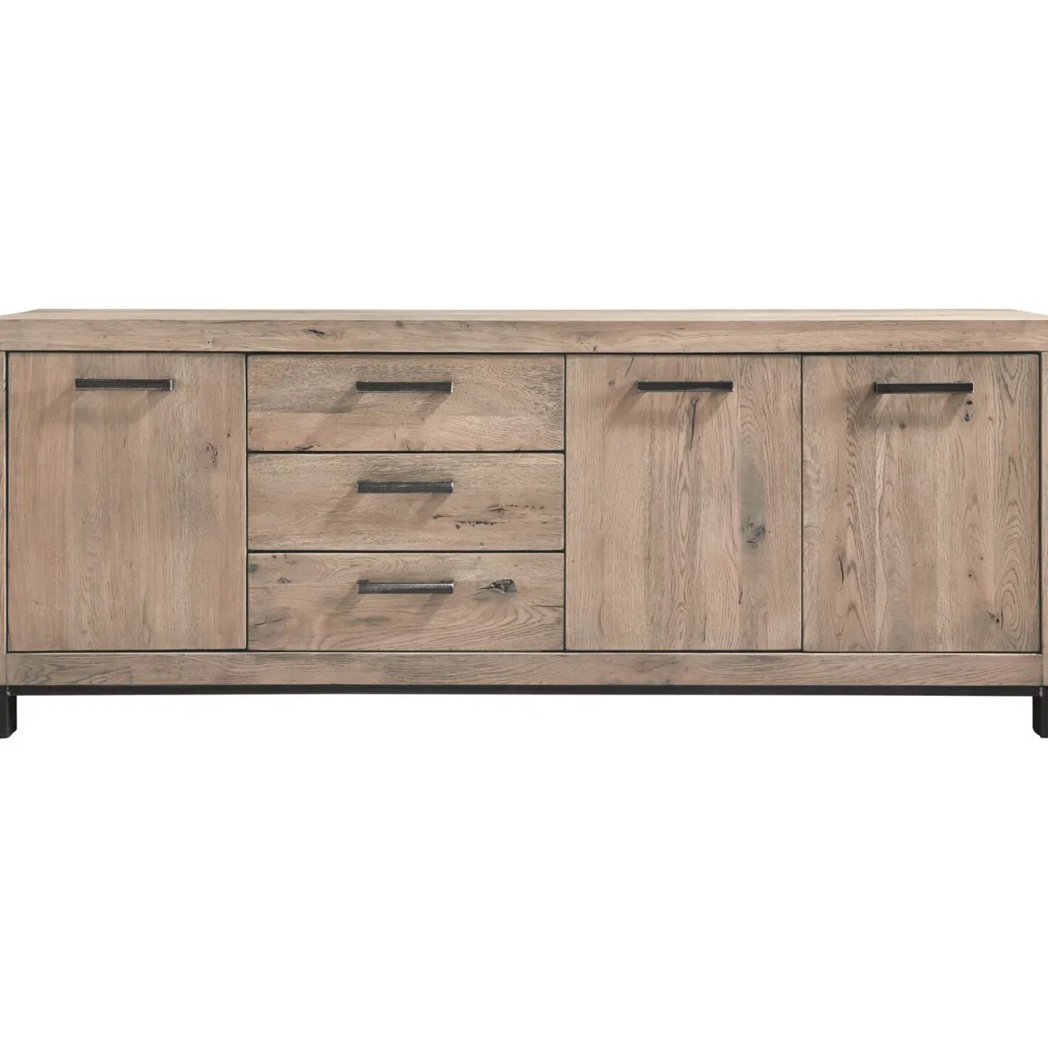 | Uitvoering | Uitgevoerd in grotendeels massief robuust eikenhout geborsteld in de kleur 38.5 moose, met 3 deuren en 3 laden. |