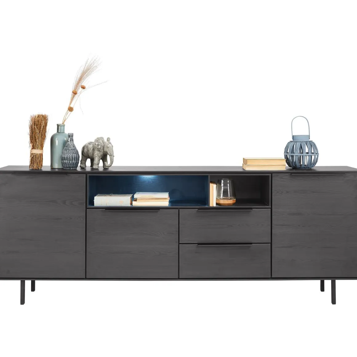 | Uitvoering | Uitgevoerd in melamine met noir decor in combinatie met zwart metalen frame, met 3 deuren, 2 laden en 2 open vakken. |