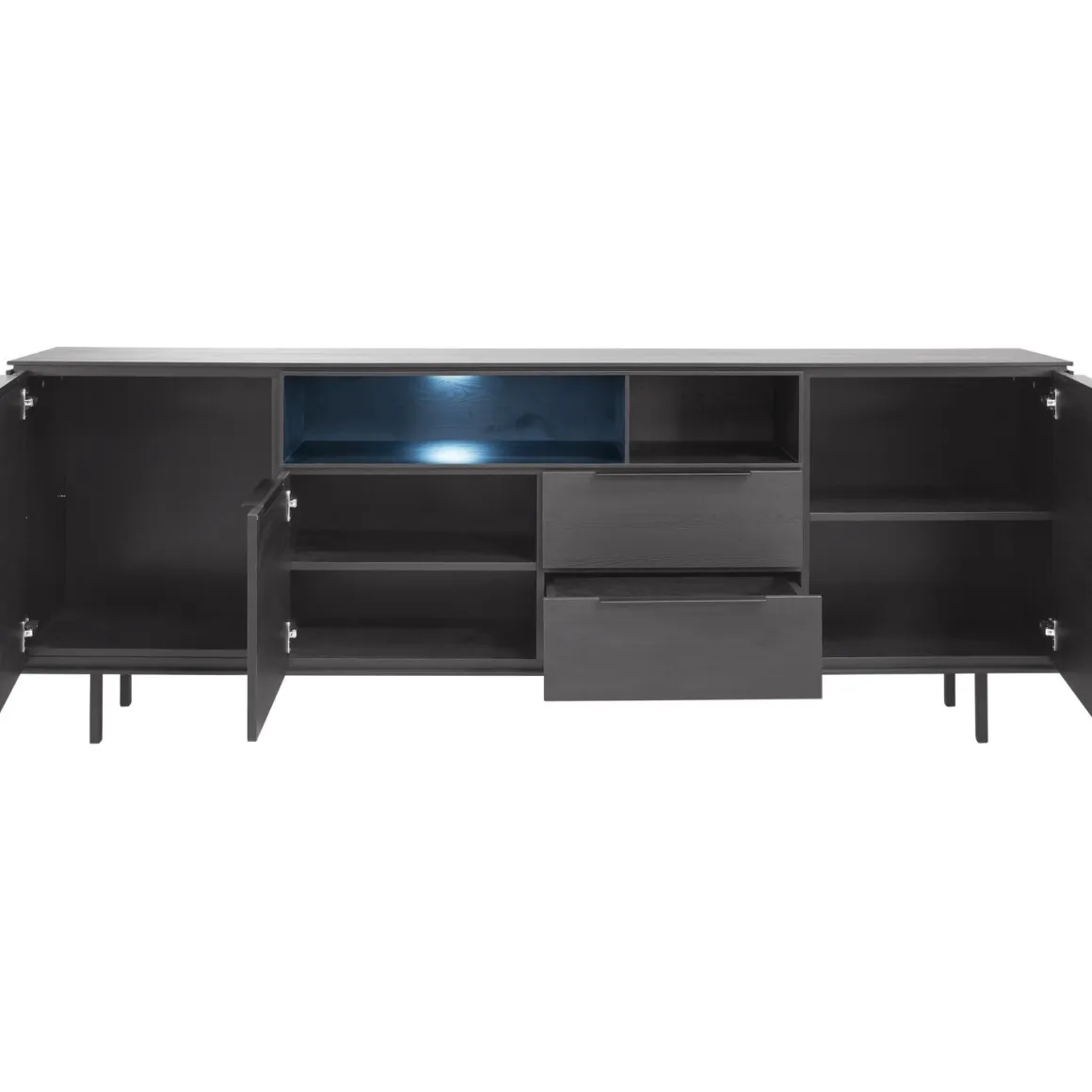 Met een hoogte van 65 cm en een breedte van 220 cm, biedt het dressoir lekker veel opbergruimte. De open vakken zijn ideaal om leuke accessoires in te leggen of zetten. De open vakken kunnen (tegen meerprijs) worden voorzien van led-verlichting, voor extra sfeer.