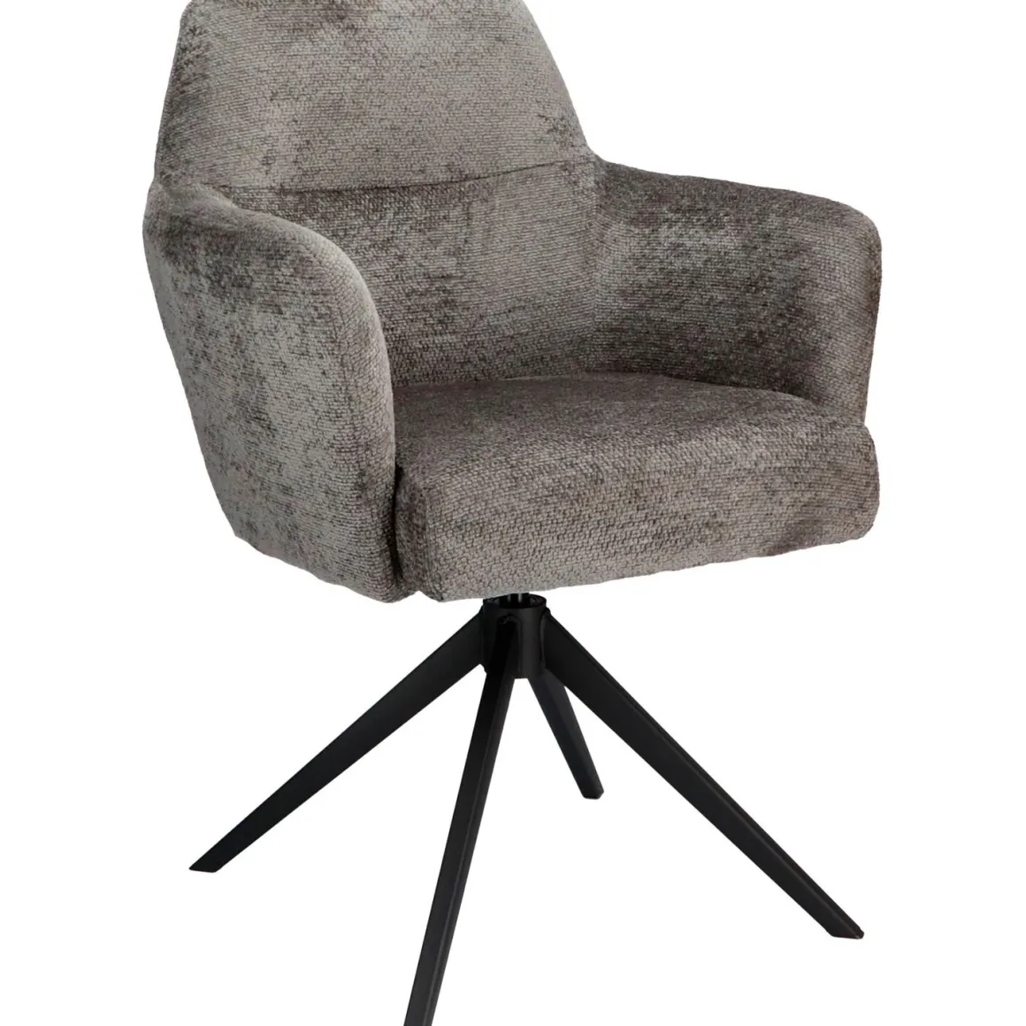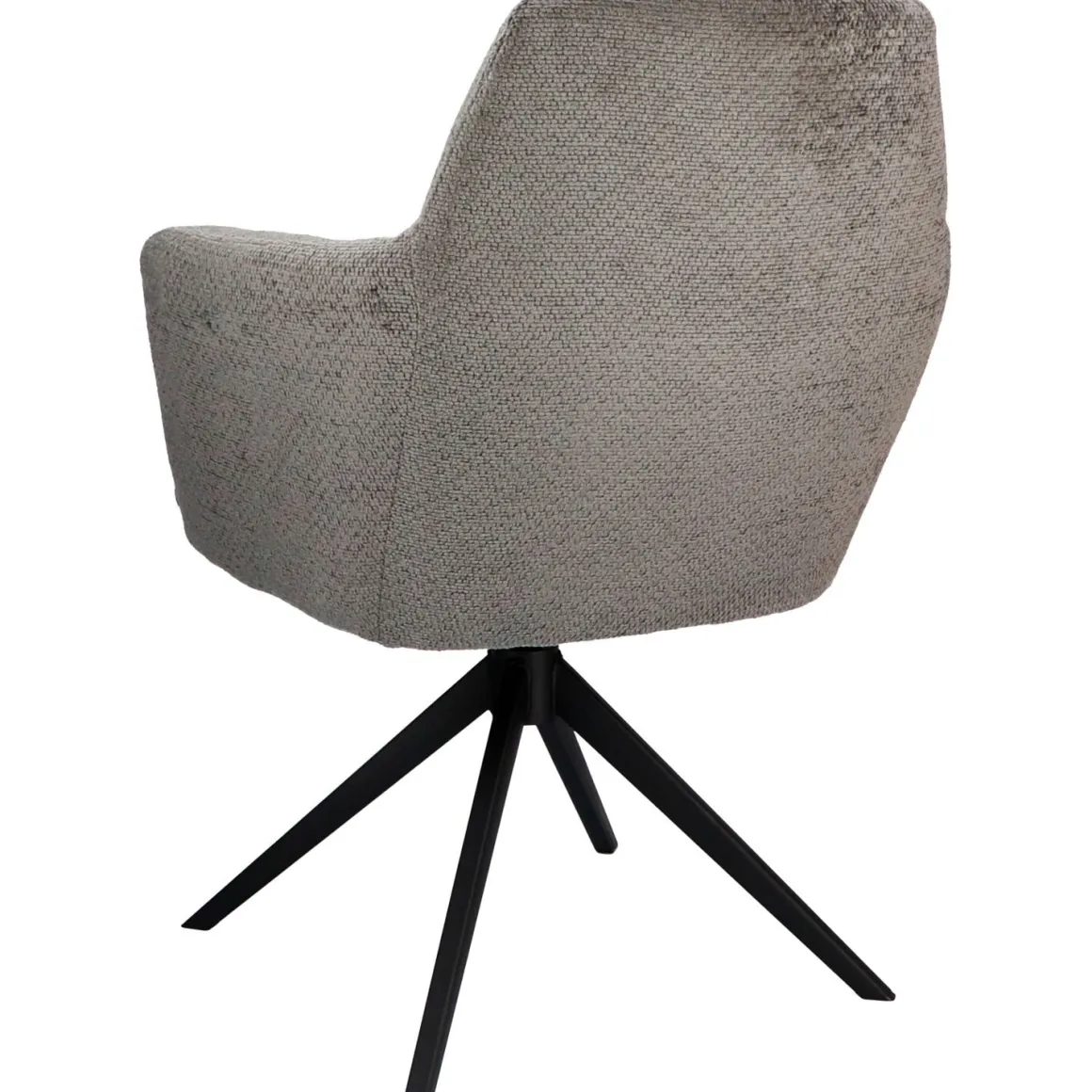 Eetkamerstoel Balestro is voorzien van armleuningen en uitgevoerd in een grijze wat grovere weefstof. Deze stof voelt zacht aan en heeft een mooie glans, wat een luxe uitstraling heeft. De armleuningen en de rugleuningen zijn rond afgewerkt, hierdoor heeft de stoel een elegante uitstraling.