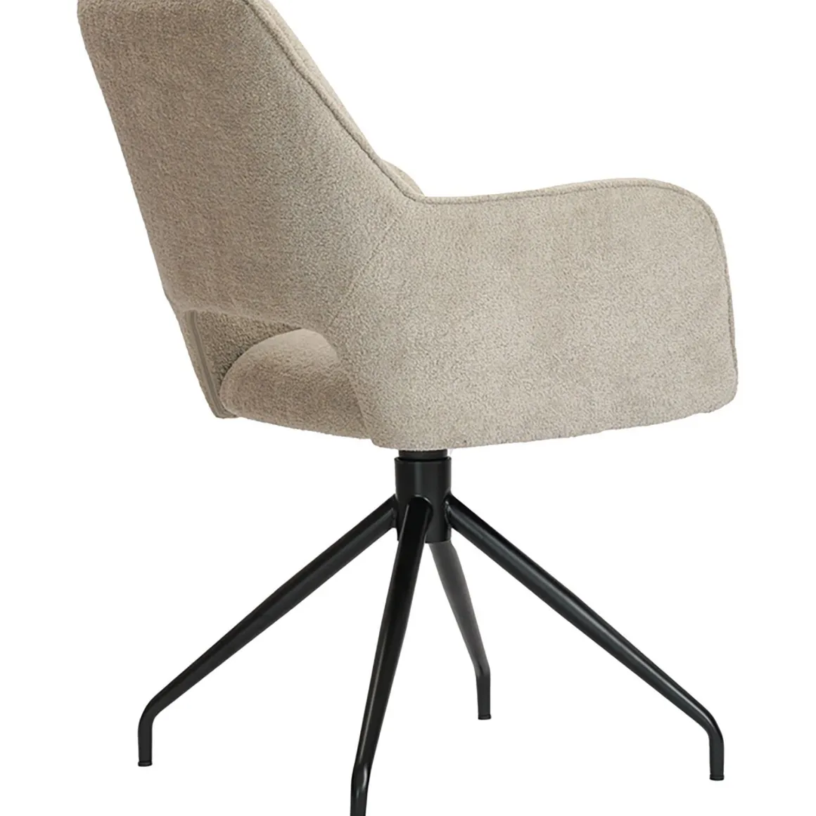 De kuip is vormgegeven met een prettige ronding, waardoor je comfortabel zit tijdens lange etentjes. De armleuningen hebben een hoogte van 66 cm, waardoor ze perfect onder de meeste standaard eettafels passen. Voor een optimaal gebruik raden we aan om rekening te houden met een speling van 2 tot 2,5 cm tussen de armleuning en de onderkant van het tafelblad. De stoel staat op een stevige zwarte kruispoot, die niet alleen zorgt voor een moderne uitstraling maar ook is uitgerust met een 360-graden draaifunctie voor extra gebruiksgemak. De montage is eenvoudig zelf te doen met behulp van de bijgeleverde instructies.