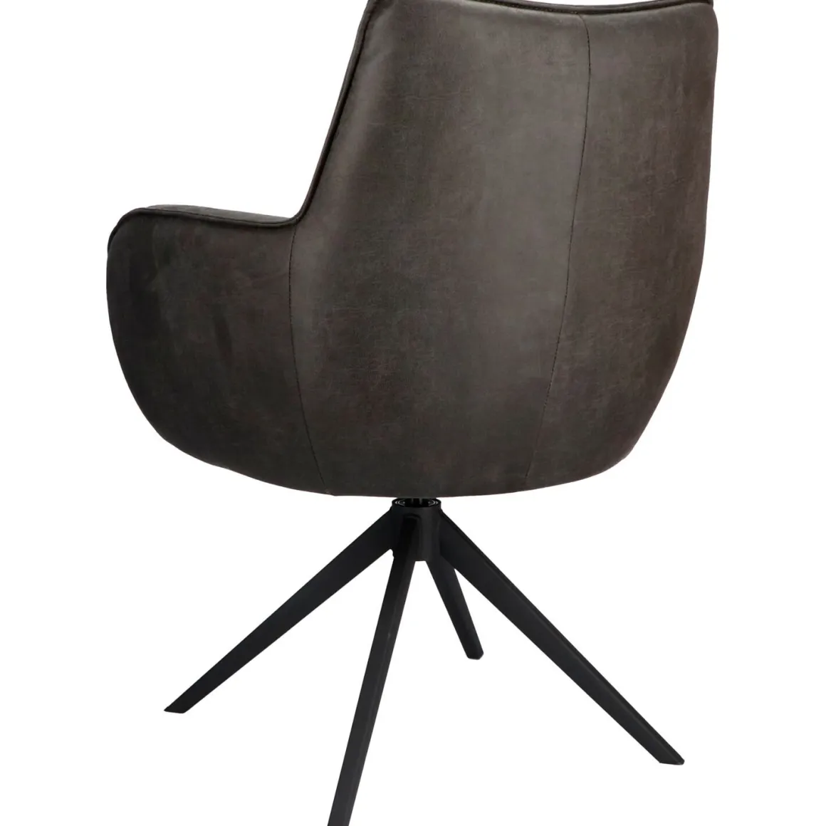 De armstoel Dordona is een comfortabele en moderne toevoeging aan de eetkamer. De stoel is uitgevoerd in een zachte microlederstof in een diepe antraciettint. Deze stof voelt fluweelzacht aan, heeft een luxe uitstraling en is tegelijkertijd slijtvast en onderhoudsvriendelijk. De afgeronde armleuningen en de zwarte metalen draaipoot geven de Dordona een eigentijdse look. Dankzij de prettig gevormde kuip en de vaste kussens in rug en zitting biedt de stoel optimaal zitcomfort, ook tijdens lange avonden aan tafel.