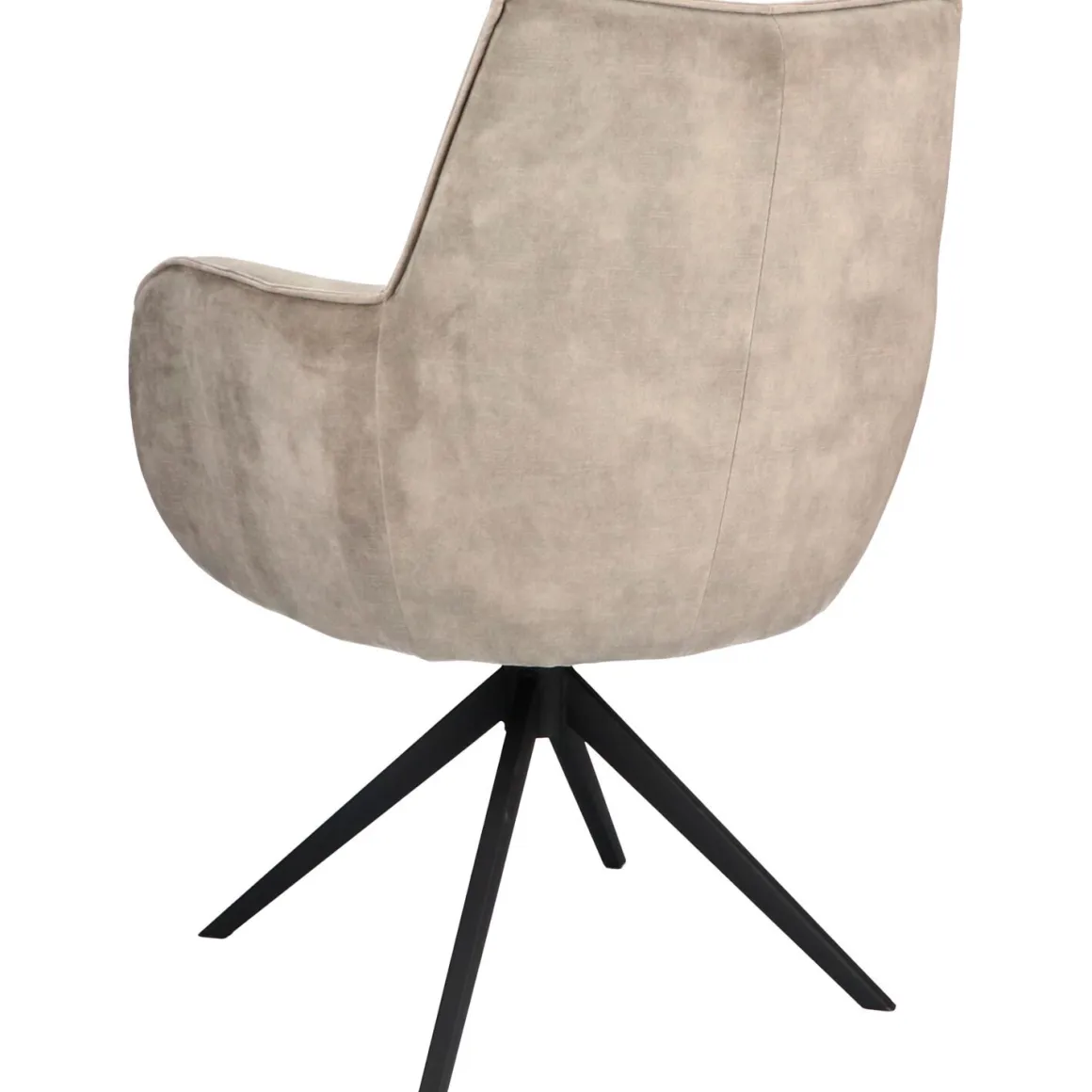 De armstoel Dordona is een comfortabele en moderne toevoeging aan de eetkamer. De stoel is uitgevoerd in een zachte velvetstof in een grijs-beige tint. Deze stof voelt fluweelzacht aan, heeft een luxe uitstraling en is tegelijk slijtvast en onderhoudsvriendelijk. De afgeronde armleuningen en de zwarte metalen draaipoot geven de Dordona een eigentijdse look. Dankzij de prettig gevormde kuip en de vaste kussens in rug en zitting biedt de stoel optimaal zitcomfort, ook tijdens lange avonden aan tafel.