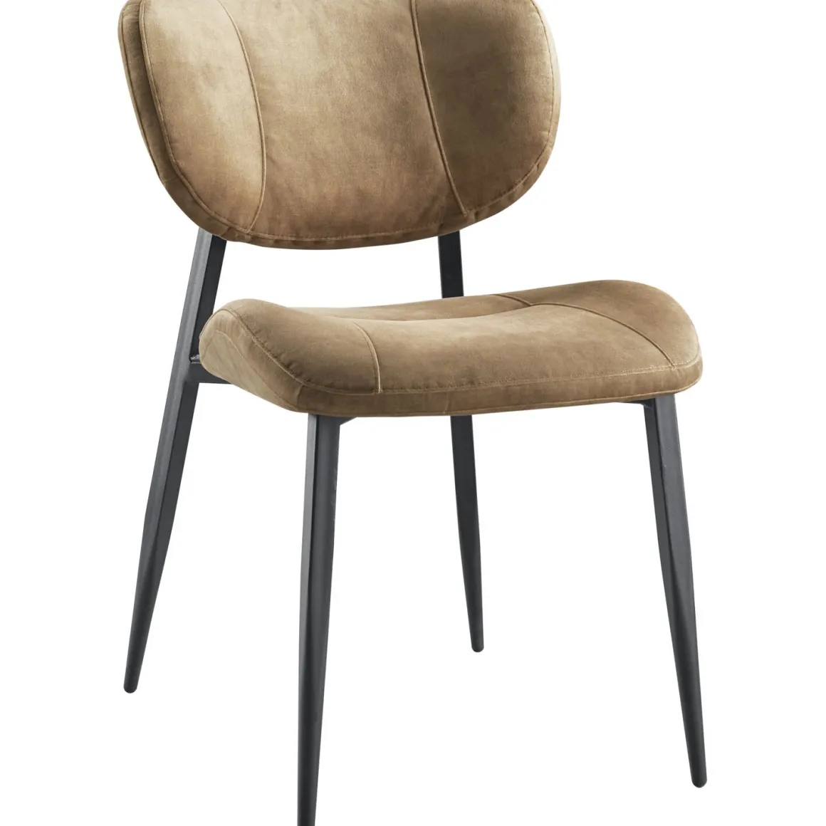 Eetkamerstoel Gomba combineert een tijdloze uitstraling met een luchtig design. Dankzij de open rug krijgt de stoel een speelse uitstraling en oogt de eethoek minder massief. Uitgevoerd in een zachte velvetstof in lichtbruin straalt het ontwerp warmte en verfijning uit. De stof heeft korte, rechtopstaande vezels die zorgen voor een subtiele vleug: afhankelijk van de lichtinval lijkt de kleur lichter of donkerder. Velvet voelt luxe en zacht aan, terwijl het ook onderhoudsvriendelijk is. De sierstiksels op zowel de rugleuning als de zitting accentueren de licht rond lopende vormen, terwijl het zwarte metalen frame de stoel een stoere uitstraling en stevige basis geeft.