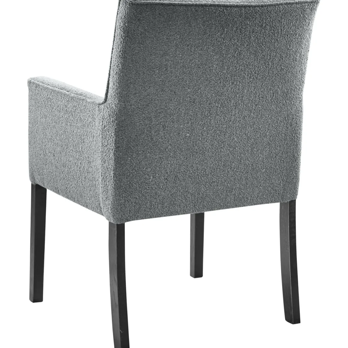 Armstoel Avanza is bekleed met een grijze boucléstof met een rijke, volle structuur. De stof voelt heerlijk zacht aan en heeft een levendige uitstraling dankzij de fijne geweven lussen. Dit geeft de stoel een warme, uitnodigende look die perfect past in een sfeervol interieur. De fraaie bies in dezelfde stof als de bekleding en de zwarte houten poten zorgen voor een stijlvol en rustig contrast. De poten zijn al gemonteerd, dus de stoel is direct klaar voor gebruik.