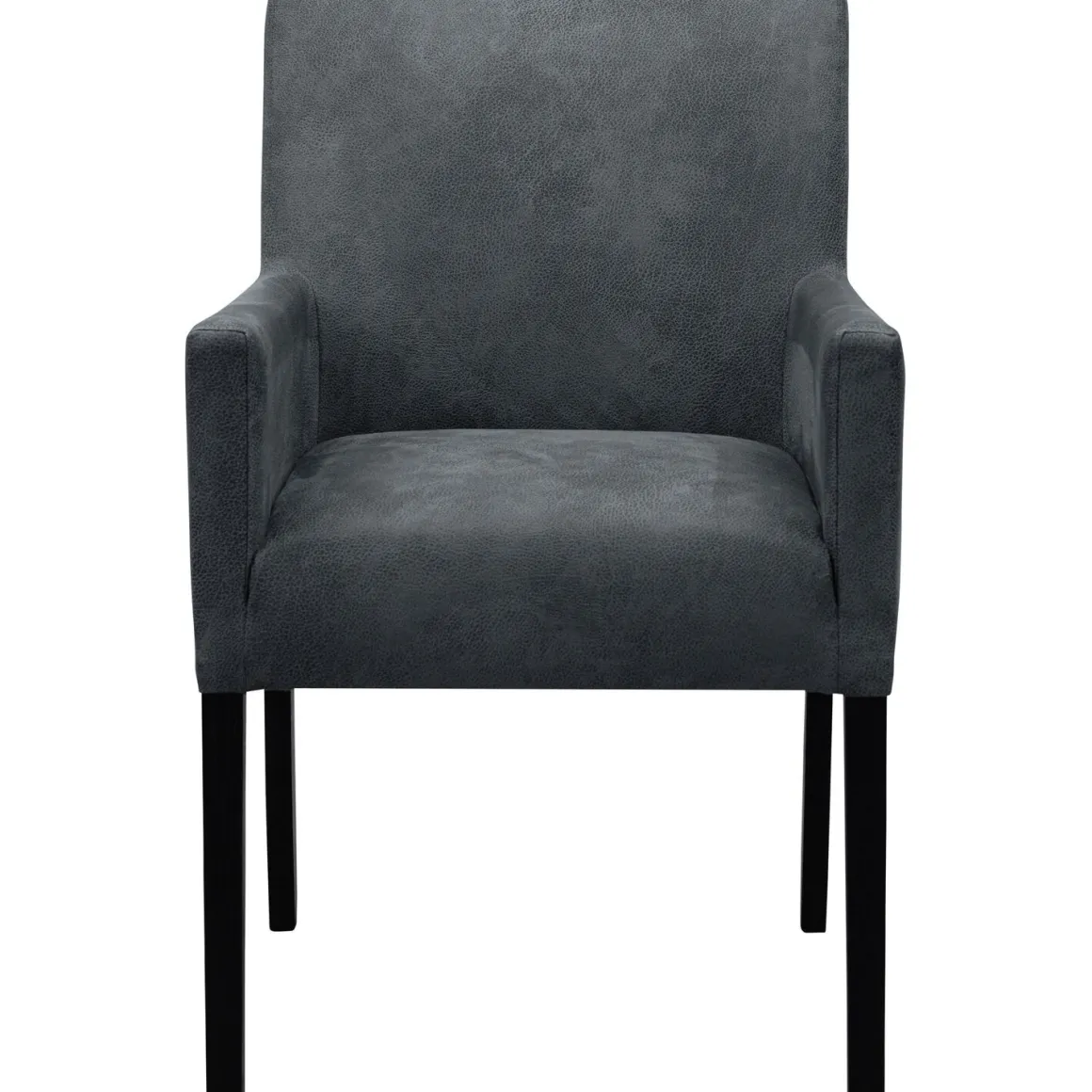Armstoel Avanza heeft een krachtige, moderne uitstraling. De stoel is bekleed met donkergrijs microleder: een samengestelde bekleding van leder en textiel. Het combineert de luxe uitstraling van leer met het comfort en onderhoudsgemak van stof. De matte structuur en de diepe kleur geven de stoel een stoere, stijlvolle look. De zwarte houten poten zorgen voor een strak en rustig contrast. De poten zijn al gemonteerd, dus de stoel is direct klaar voor gebruik.