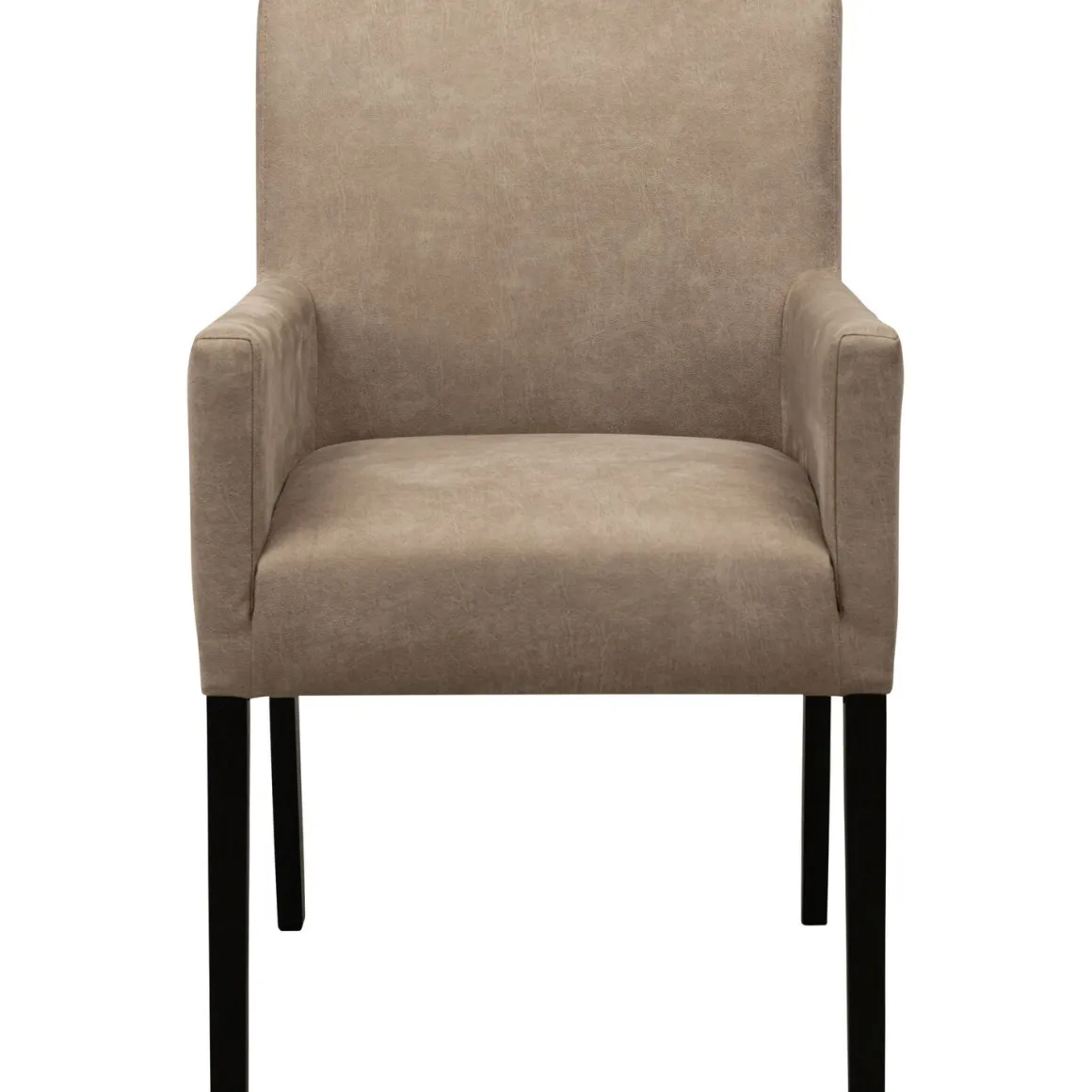 Armstoel Avanza is bekleed met microleder in een grijs-beige kleur. Deze bekleding heeft een grovere, robuuste uitstraling met een duidelijke structuur die doet denken aan rundleer. De stof voelt wat steviger aan en heeft een meer lederachtige grip dan zachtere microledervarianten. De matte afwerking en stoere look maken deze stoel een perfecte match voor industriële of landelijke interieurs. De zwarte houten poten zorgen voor een strak en rustig contrast. De poten zijn al gemonteerd, dus de stoel is direct klaar voor gebruik.