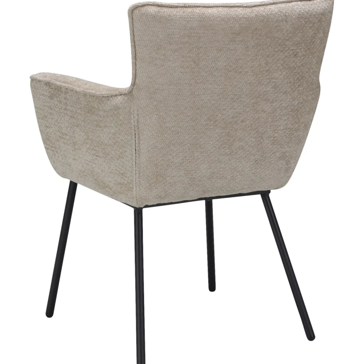 De kuipvorm van de zitting zorgt voor een comfortabele en stevige zit. De armleuning heeft een hoogte van 67 cm, waardoor de stoel onder de meeste standaard eettafels past. De rugleuning is voorzien van een elegant blokstiksel, wat een subtiel designelement toevoegt. De stoel is maximaal belastbaar tot 125 kg en de metalen poten moeten zelf worden gemonteerd; met de bijgeleverde handleiding is dat eenvoudig te doen.