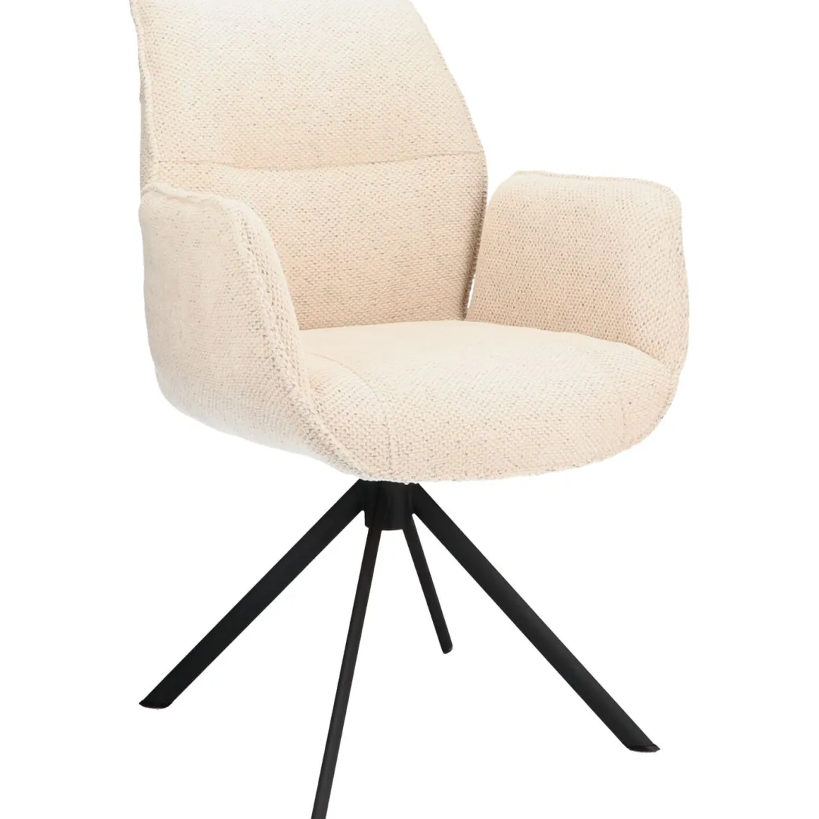 | Uitvoering | Uitgevoerd in stof macan 102-ecru met een dubbele laag polyetherschuim in de zitting, polyetherschuim in de rug en zwart metalen poten met 360 graden draaifunctie met auto-return. |