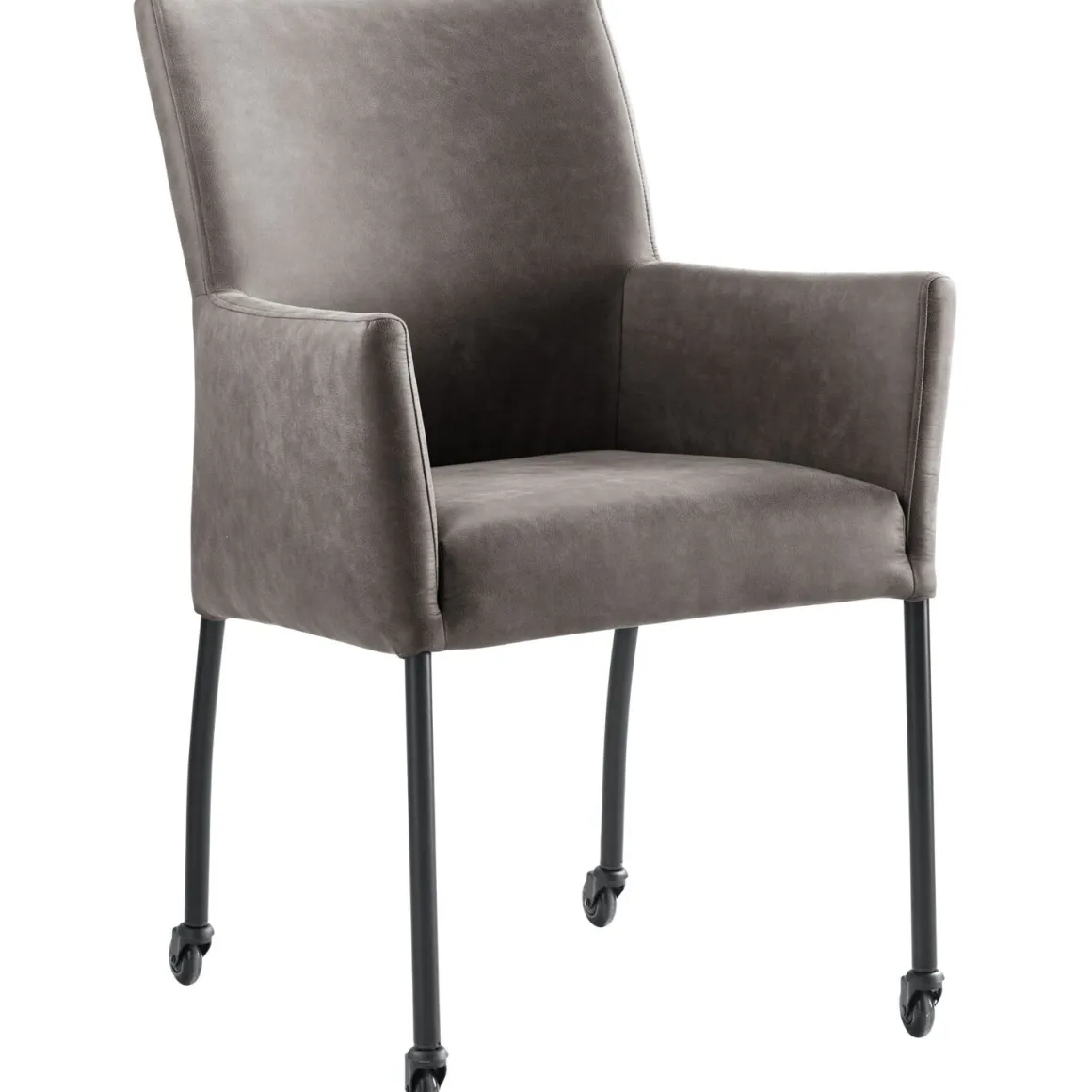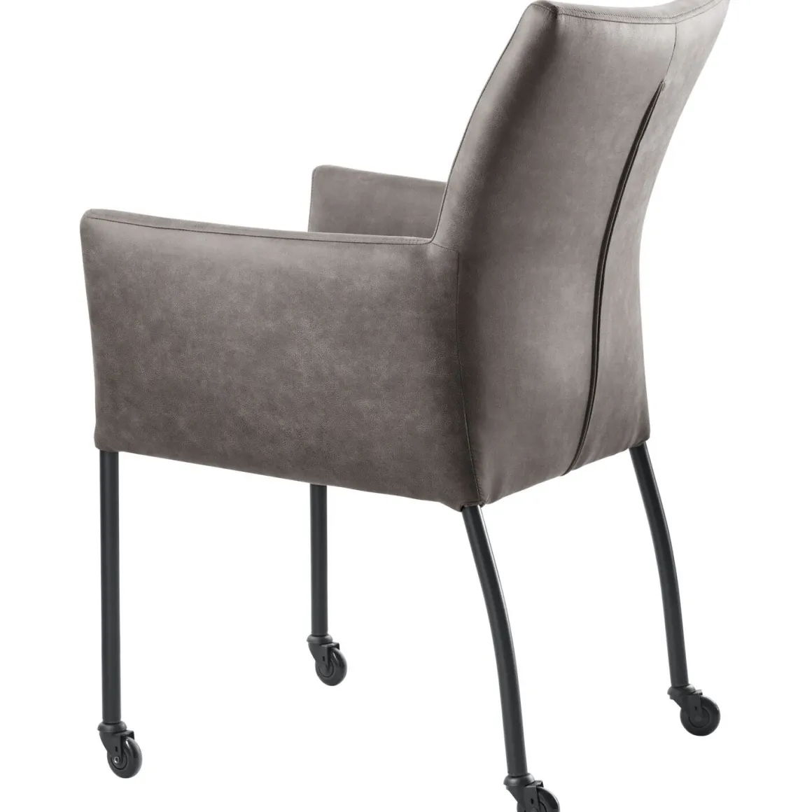 Sessione is een ranke eetkamerstoel met armleuningen met een elegante uitstraling. De stoel is bekleed met een donkergrijze microvezelstof die erg geschikt is voor intensief gebruik. De stof is opgebouwd uit synthetische vezels waardoor deze erg sterk is. Desondanks voelt hij erg zacht aan. Bovendien is de stof makkelijk in onderhoud. Dankzij de zwarte wieltjes is de stoel eenvoudig en snel te verplaatsen. Op de achterzijde van de rugleuning zit een ritssluiting in dezelfde kleur als de stof.