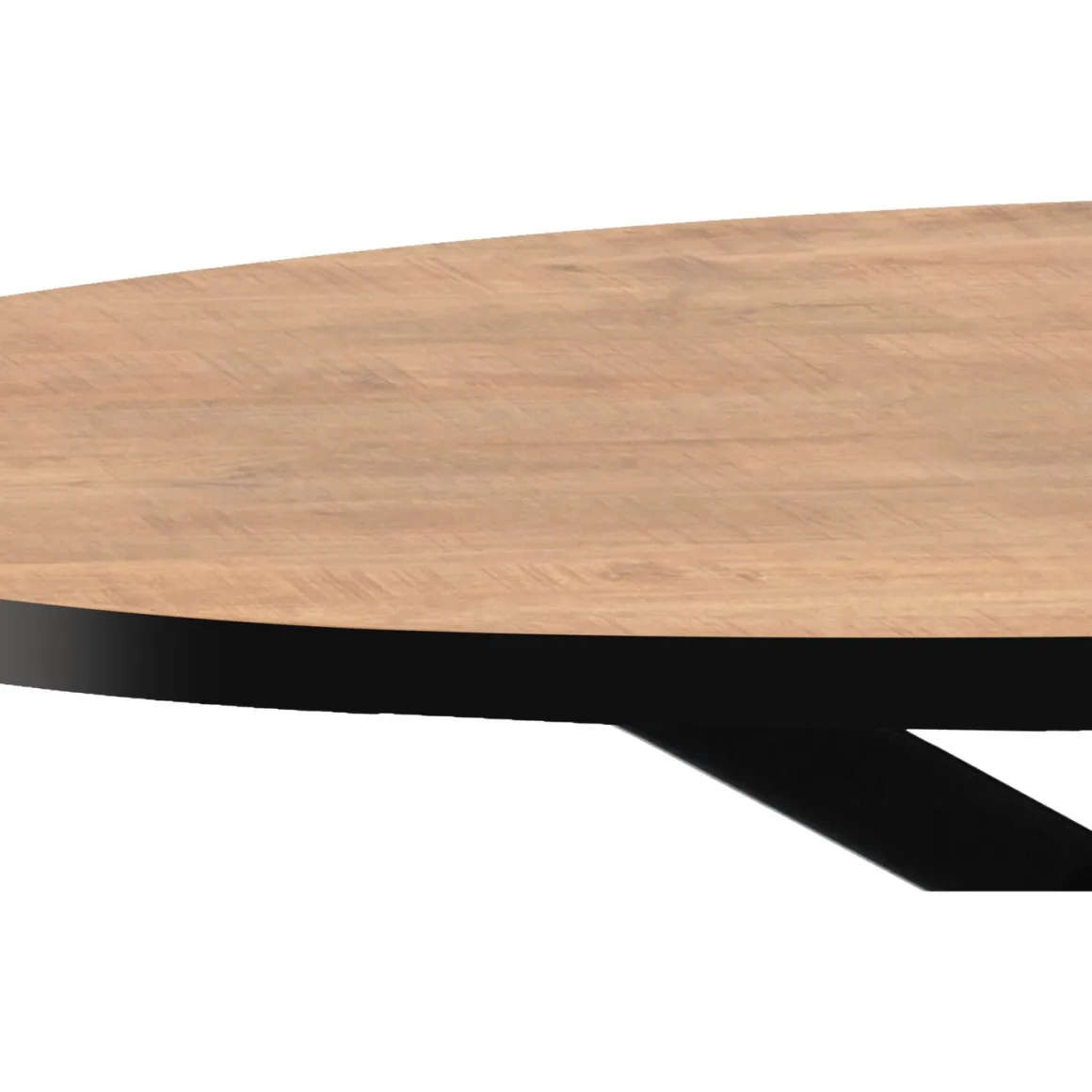 Deze eettafel is 250 cm lang, 128 cm breed en 77 cm hoog. Het blad, uitgevoerd in een warme mango kleur en afgewerkt met een zwarte rand, vormt een krachtig contrast met het zwarte metalen spinonderstel. Deze combinatie geeft de tafel een moderne en robuuste uitstraling. De ovale vorm zorgt voor een speels en uitnodigend effect, terwijl de stevige spinpoot voldoende beenruimte biedt. De tafel biedt comfortabel plaats aan 6 tot 8 personen. De hoogte van de onderregel is ca. 73 cm, wat voldoende ruimte geeft voor de meeste eetkamerstoelen.