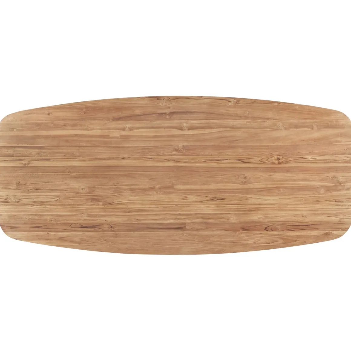 Breng een industriële touch in je interieur met deze eettafel uit de woonserie Romaro. De tafel heeft een deens ovale blad van 3 cm dik, gemaakt van massief rough teak hout, dat is afgewerkt met een hoogwaardige matte NC-lak. De verjongde (afgeschuinde) rand van het blad zorgen voor een strakke uitstraling, terwijl de spinpoot van zwart metaal (5 x 5 cm) bijdraagt aan het eigentijdse en toch stoere karakter. Met een lengte van 220 cm, breedte van 100 cm en een hoogte van 77 cm is deze tafel perfect voor elke woonkamer.