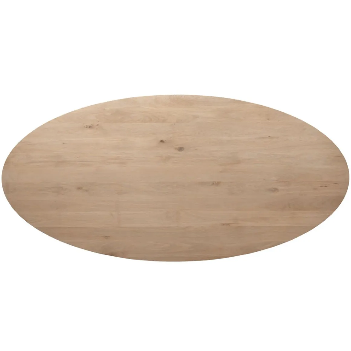 | Uitvoering | Uitgevoerd met blad 260×125 ovaal vlak, in geborsteld en genoest eiken in de kleur 68.5 Naturel Grey, met spinpoot 140x80cm, koker 8x8cm kleur zwart. |