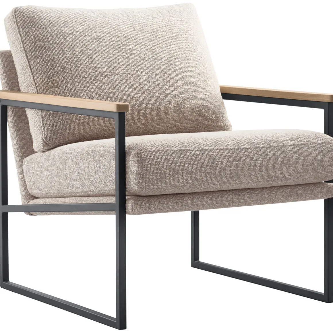 Fauteuil Claut brengt moderne eenvoud samen met warme details, passend bij een Scandinavisch geïnspireerd design. De slanke vormgeving en open armleuningen zorgen voor een luchtig, eigentijds silhouet. De metalen armleuningen zijn afgewerkt met een zwart gelakt houten legger, een stijlvol detail dat ook prettig aanvoelt voor je arm. De bekleding in een beige kleur met grijze ondertoon is uitgevoerd in een fijne weefstof met subtiele kleurnuances en een rustige structuur, die comfortabel aanvoelt en geschikt is voor dagelijks gebruik.
