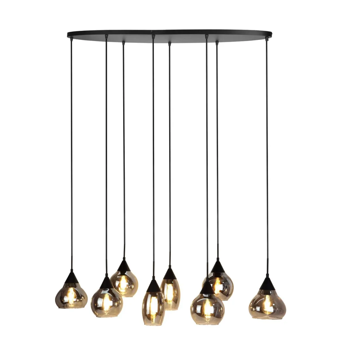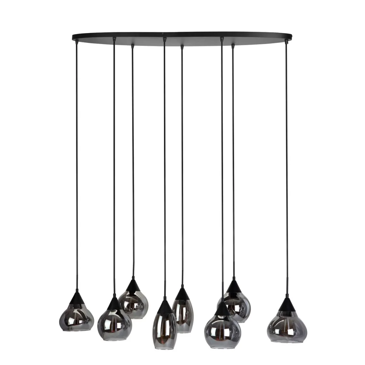 | Uitvoering | Uitgevoerd in de kleur zwart met smoke glas, met ovale plafondplaat. Geschikt voor maximaal 8×40 watt. Fitting: E27 (grote fitting). Exclusief lichtbron (gloeilamp/spaarlamp/ledlamp). |