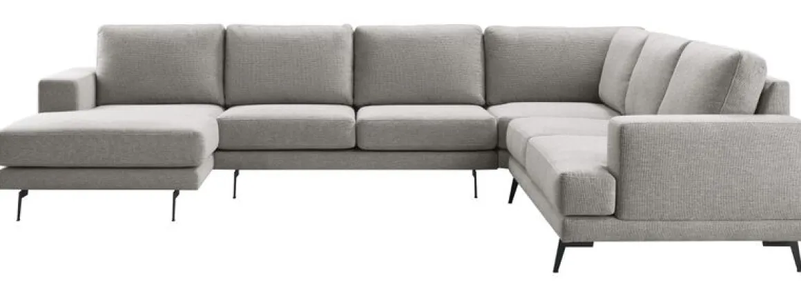 | Uitvoering | Longchair arm links + 2,5 zits zonder armen + hoekelement + 2,5 zits arm rechts uitgevoerd in stof leaf 149-steel met pocketvering met een toplaag van traagschuim in de zitting, HR-koudschuim met een afdeklaag van polyetherschuim- en siliconenvlokken in de rug en zwarte metalen poten, type M-15 (15 cm). |