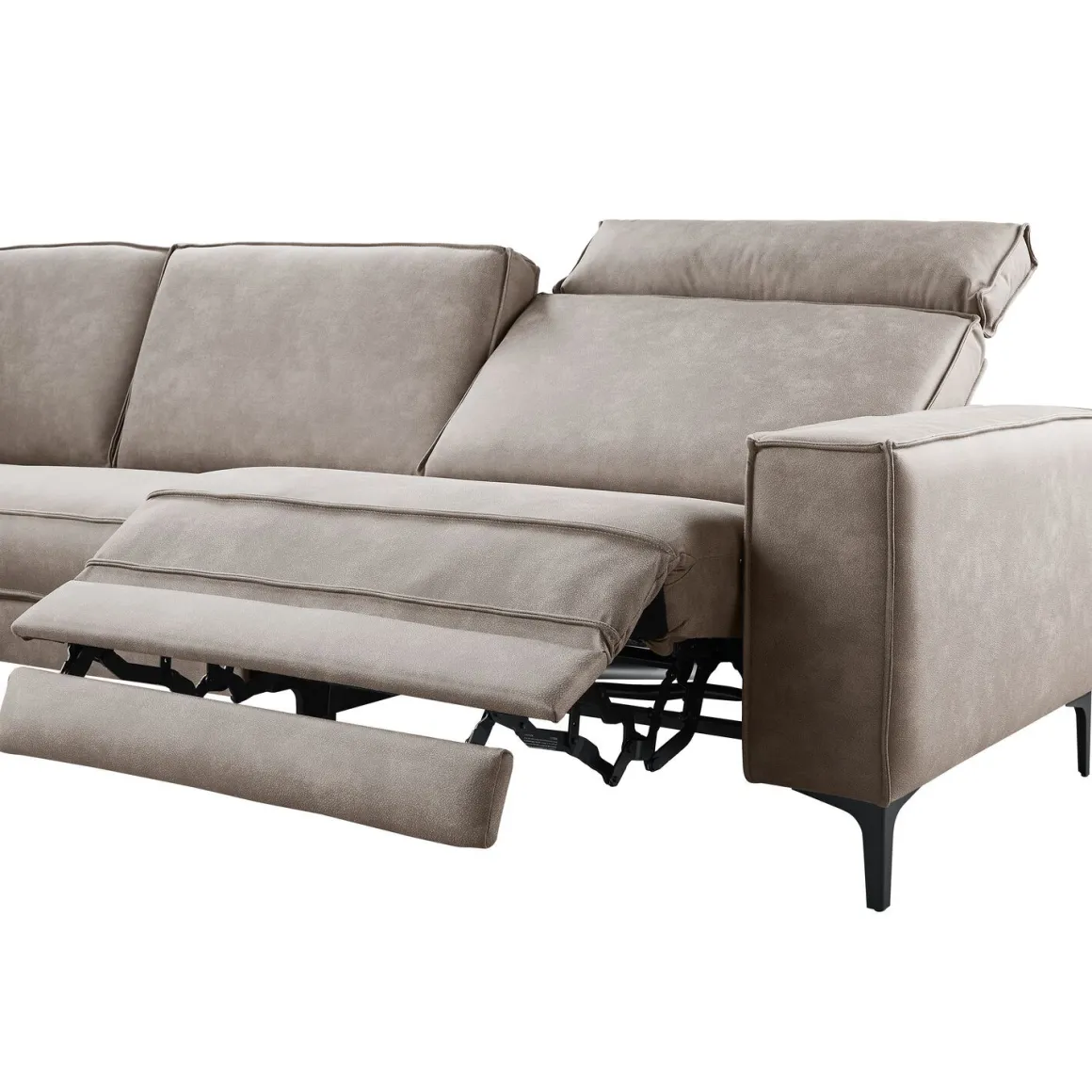 Eén van de elementen is uitgerust met een elektrische relaxfunctie. Via tiptoetsen aan de zijkant van de zitting verstel je eenvoudig de rugleuning en voetensteun. Wil je geen zichtbare snoeren? Dan kun je deze functie tegen een meerprijs uitbreiden met een accu. Een bijpassende hoofdsteun wordt standaard meegeleverd bij het element met relaxfunctie, zodat je optimaal kunt ontspannen.