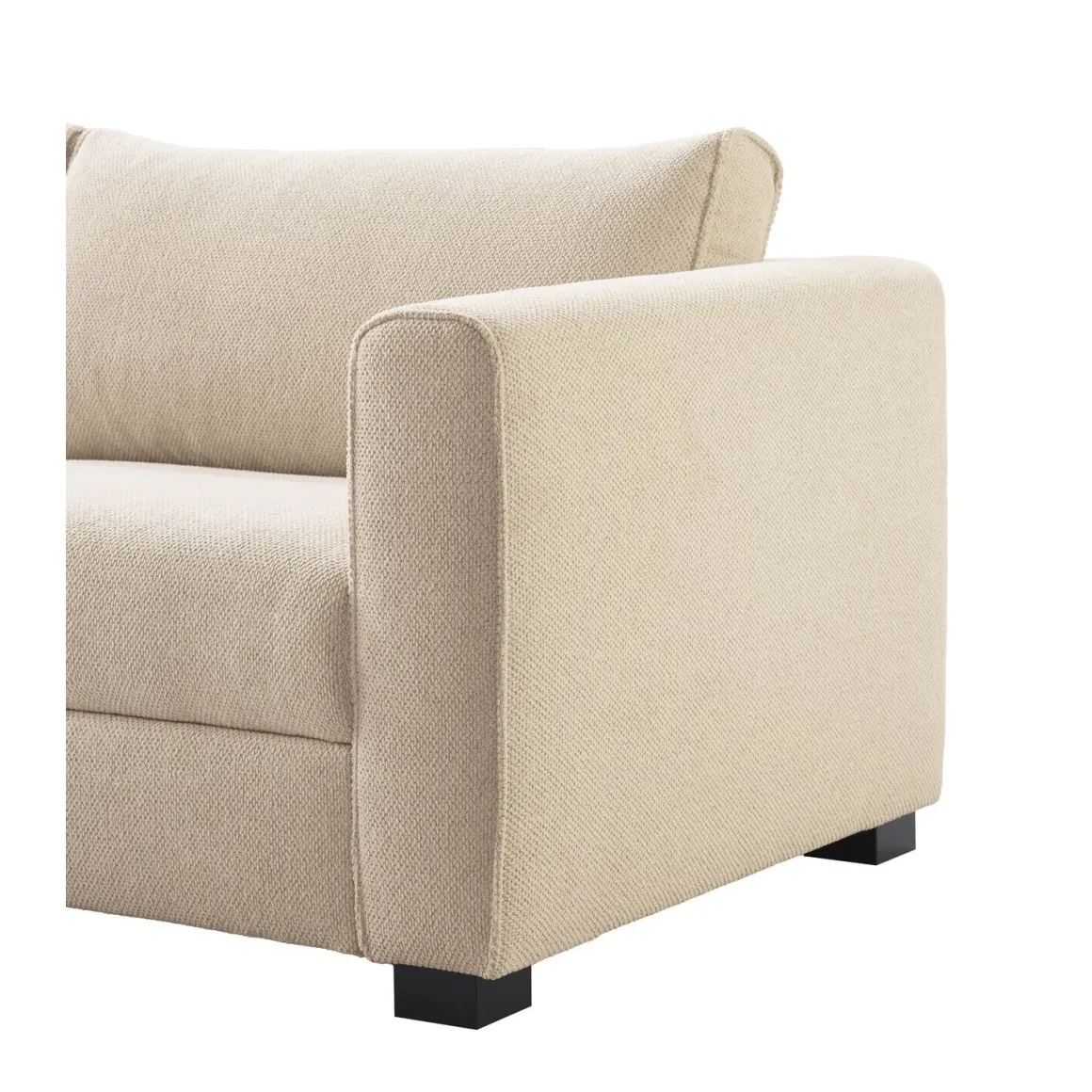 Hoekbank Licato is uitgevoerd in een sterke, slijtvaste geweven stof met chenillegarens. De zachte structuur voelt aangenaam aan en geeft de bank een warme, luxe uitstraling. De naturel ecru kleur versterkt het lichte en elegante karakter en laat zich moeiteloos combineren in verschillende interieurs. De bank is afgewerkt met een vlindernaad, wat het ontwerp een subtiel en stijlvol accent geeft. De zwarte houten poten vormen een mooi contrast en geven het geheel een moderne basis.