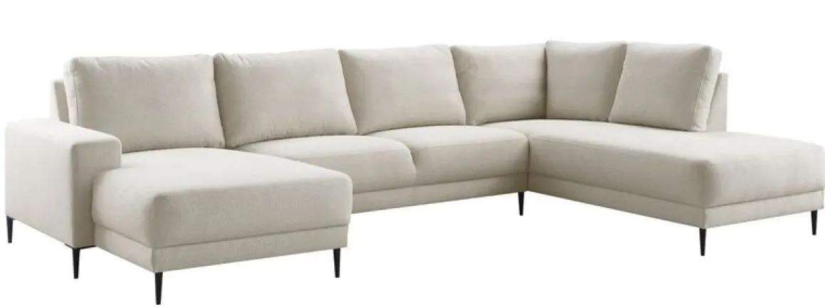 | Uitvoering | Longchair arm links + 2,5 zits zonder armen + hoek met eiland groot rechts in stof rate 01-natural met polyetherschuim in de zitting, een mix van polyetherschuim- en siliconenvlokken in de rug en zwarte metalen poten, type M-14 (13 cm). |