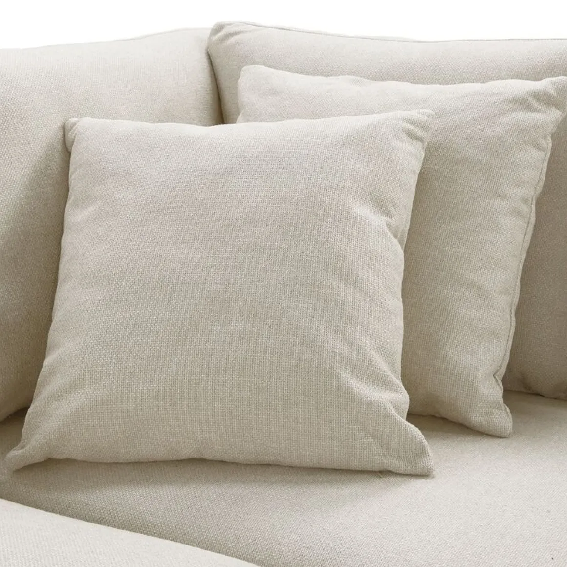 Hoekbank Portona heeft een luxe, comfortabele uitstraling door de volle rug- en zitkussens. De royale hoekbank is uitgevoerd in een trendy ecru kleurige stof. De stof is een fijne gemĂȘleerde weefstof, die lekker zacht aanvoelt.
