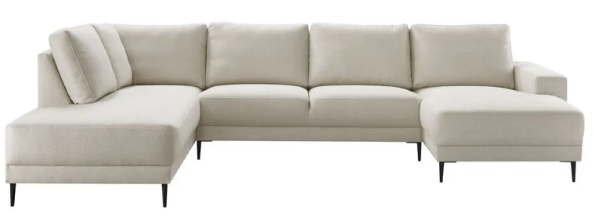 | Uitvoering | Hoek met eiland groot links + 2,5 zits zonder armen + chaise longue arm rechts in stof rate 01-natural met HR-koudschuim in de zitting, HR-koudschuim met een afdeklaag van polyetherschuim- en siliconenvlokken in de rug en zwarte metalen poten, type M-14 (13 cm). |