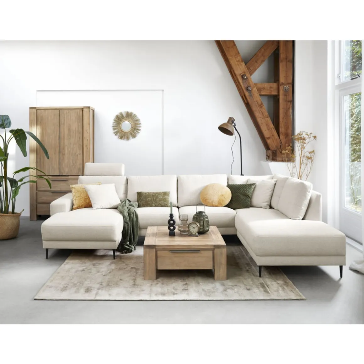 Hoekbank Portona heeft een luxe, comfortabele uitstraling door de volle rug- en zitkussens. De royale hoekbank is uitgevoerd in een trendy ecru kleurige stof. De stof is een fijne gemĂȘleerde weefstof, die lekker zacht aanvoelt.