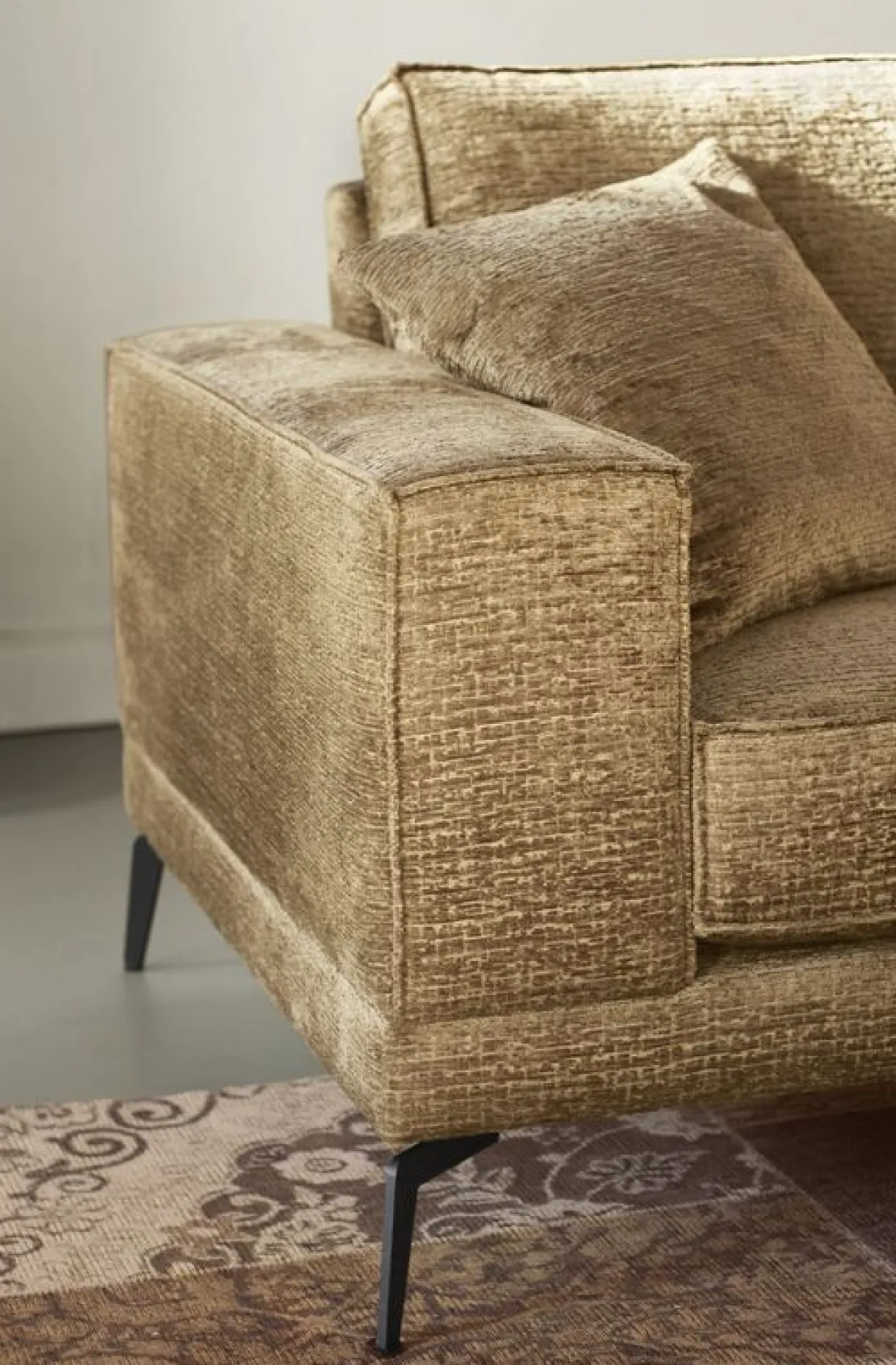 Met deze hoekbank haal je een echte eyecatcher in huis! De stof waarmee deze bank bekleed is, is van hoge kwaliteit en voelt heerlijk zacht aan. Er zit een licht 3D effect in, wat zorgt voor een volumineuze en luxe uitstraling. De kleur laat zich het beste omschrijven als bruin, maar neigt naar het groen en heeft een gouden nuance. De strakke lijnen van dit model worden geaccentueerd door de zwart metalen designpoten en de gesloten vlindernaad waarmee de armleuningen en kussens zijn afgewerkt. Zie jij deze bank al bij jou thuis staan schitteren?
