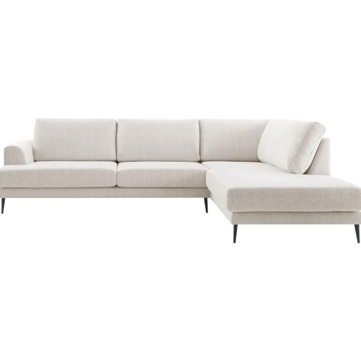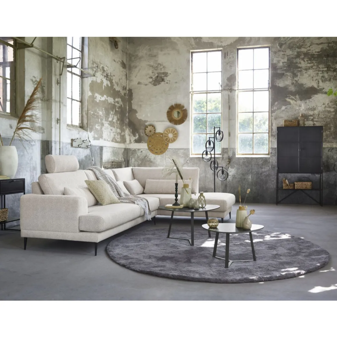 Hoekbank Ansio kenmerkt zich door zijn eigentijdse uitstraling. Hierdoor past het model in vrijwel ieder interieur. De hoekbank is bekleed met een beige bouclé stof. Deze stof bestaat uit los geweven patronen, draden en lussen. Ondanks de onregelmatige structuur die hierdoor ontstaat, voelt de stof lekker zacht en warm aan. De bank heeft een wat diepere zit maar door de bijgeleverde lendenkussens kun je toch heerlijk zitten ook als je wat minder lang bent, dus uitermate geschikt voor zowel lange als minder lange mensen. Ook zorgen de lendekussens voor een heerlijk comfort en in combinatie met de afgeronde arm en zwarte metalen poten geeft dit de bank een moderne en luxe uitstraling.