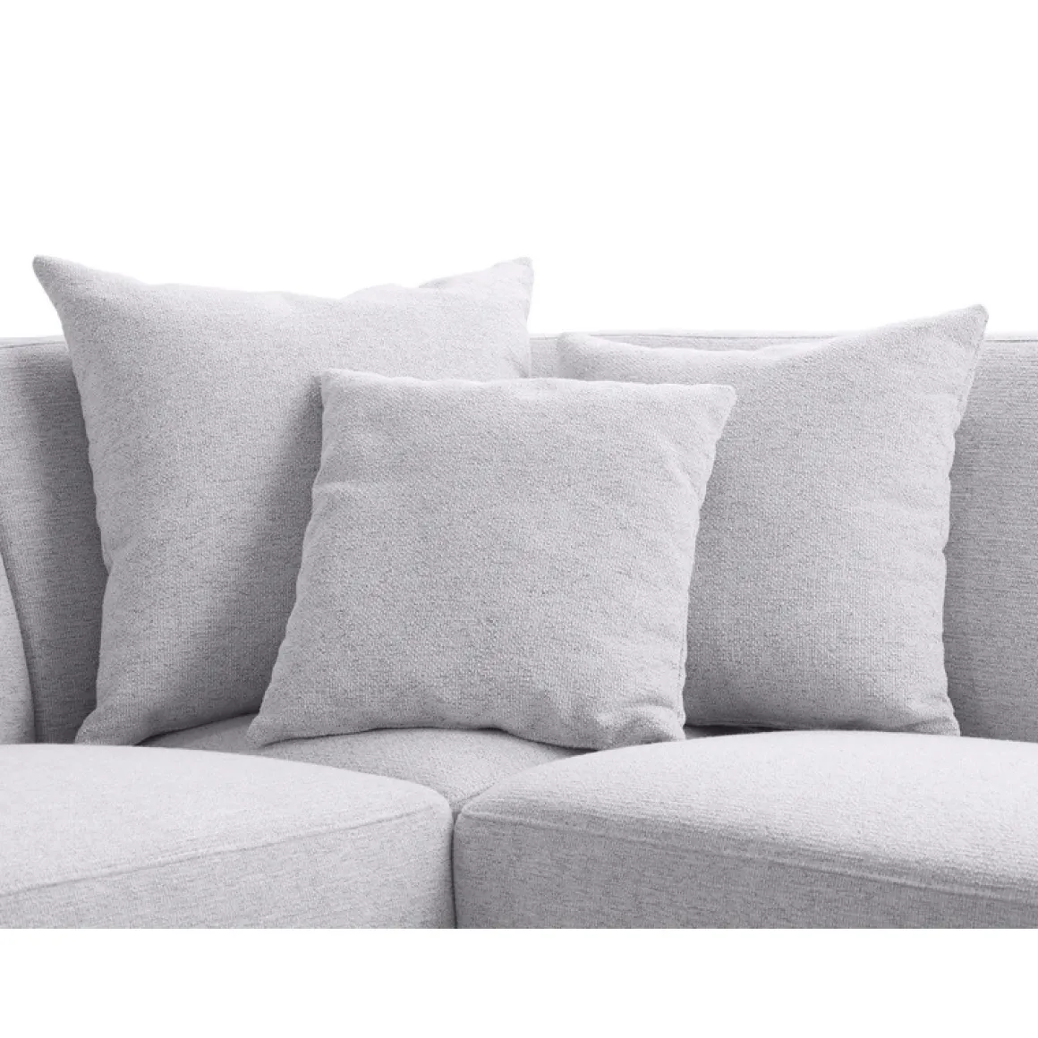 | Uitvoering | Longchair rond links + 3 zits zonder armen + hoek met eiland rond rechts in stof leaf 40-ashgrey met bonellvering met een toplaag van HR-koudschuim in de zitting en HR-koudschuim in de rug en zwarte metalen poten, type MF1 (12 cm). |