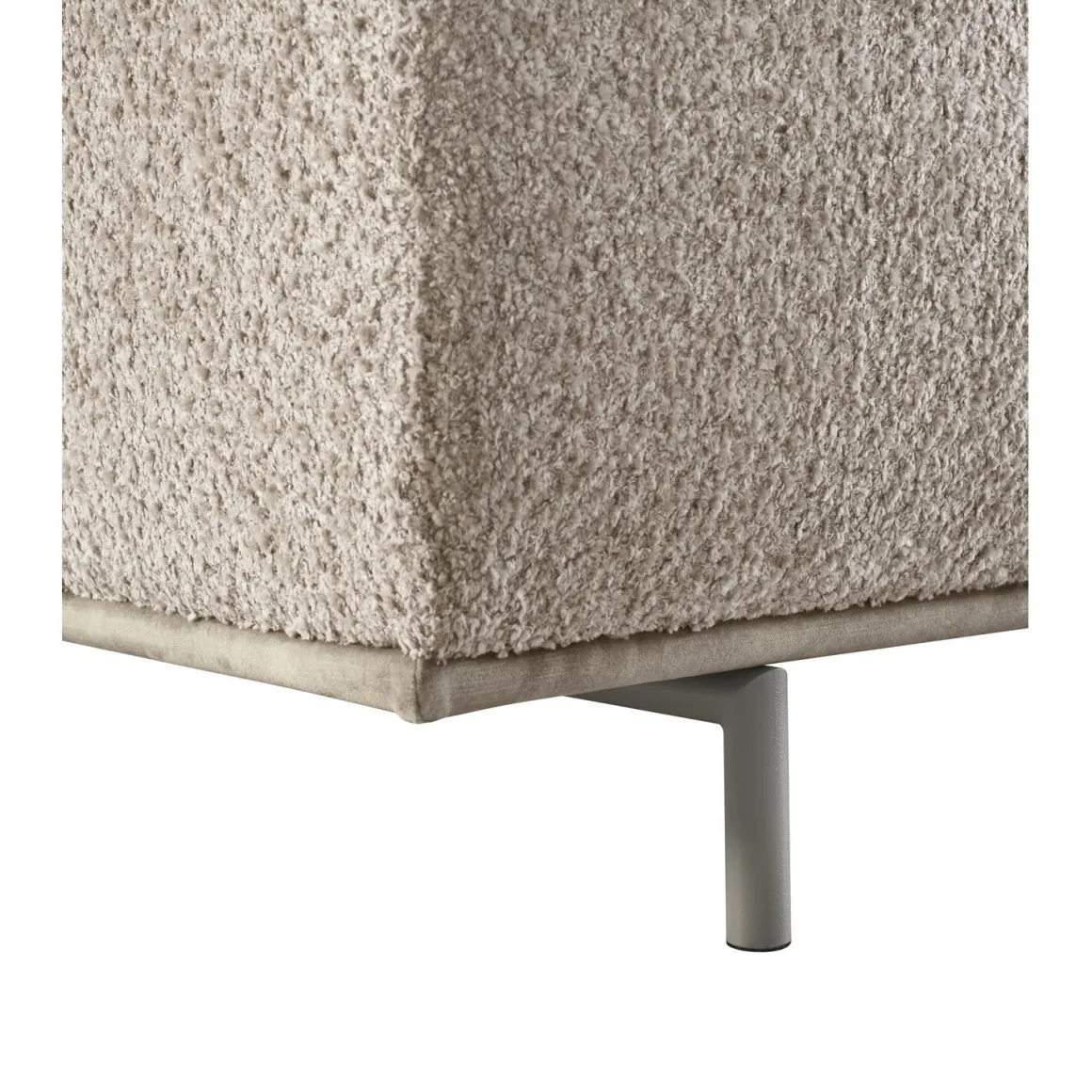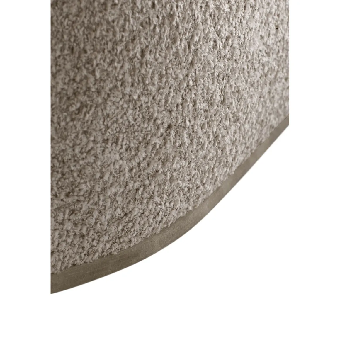 Deze hoekbank is een echte eyecatcher: zacht in vorm, hip in uitstraling en helemaal van nu. Door de rond doorlopende zitting en rug krijgt het ontwerp een zachte, vloeiende vorm die volledig aansluit bij de huidige woontrends. De bank is bekleed met een gemêleerde weefstof in een grijs-taupe tint. Door de combinatie van verschillende garens ontstaat een subtiele glans, waardoor de kleur afhankelijk van de lichtinval warmer of juist wat grijzer kan ogen. De plint is uitgevoerd in een velvet stof in een beige-grijze tint, wat een luxe en stijlvol contrast vormt. De donkergrijze metalen poten voegen een verfijnd designaccent toe.