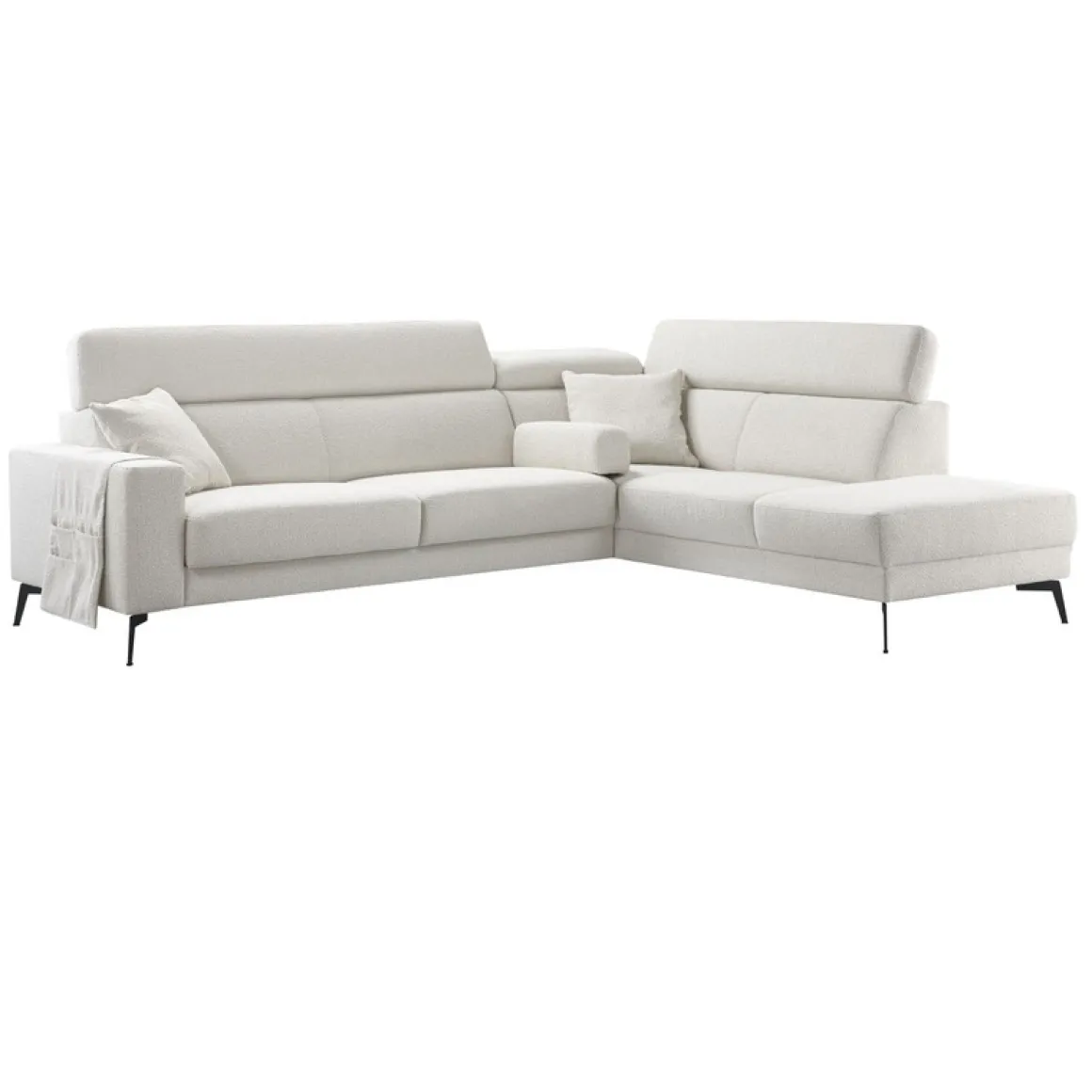 Deze ruime hoekbank met vaste zit- en rugkussens heeft de ideale combinatie van comfort en hedendaags design. De bank is gestoffeerd in de mooie stof Cosmo. Deze bouclé stof springt direct in het oog door de grove structuur en de matte uitstraling. De stof heeft een zachte touch en door het gebruik van verschillende beige en crèmekleurige draden krijg je een two-tone kleurenpalet wat een speciaal effect geeft aan de bank. De zwart metalen poten zijn niet alleen stevig en duurzaam, maar voegen ook een vleugje elegantie toe aan je interieur. Ze tillen de hele bank naar een hoger niveau, zowel qua stijl als functionaliteit.
