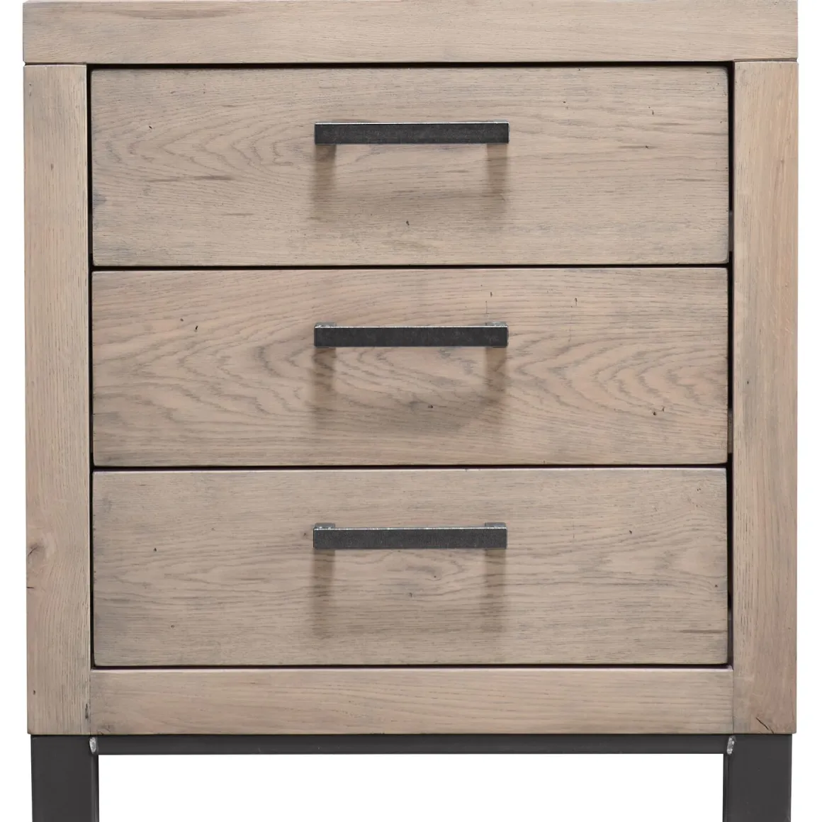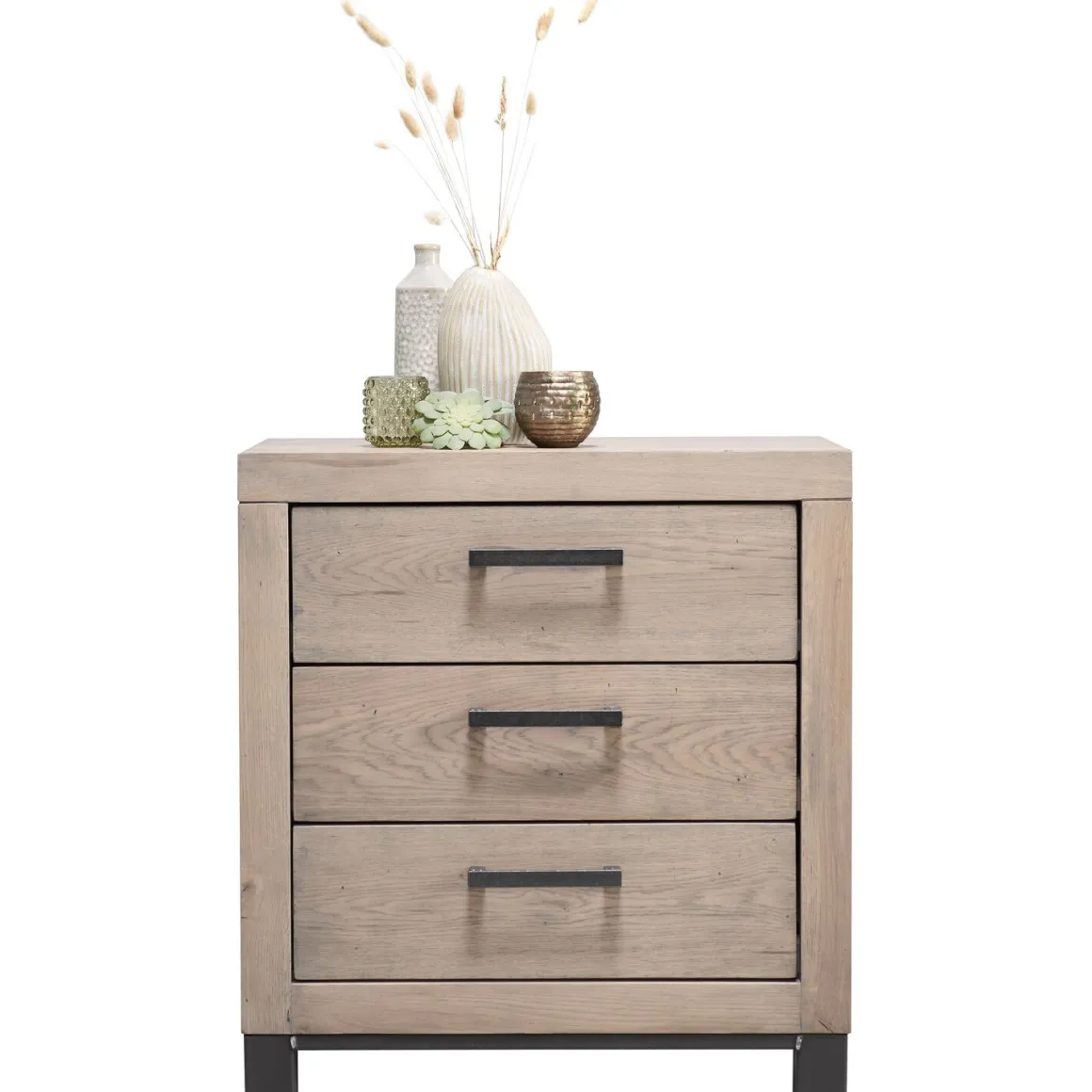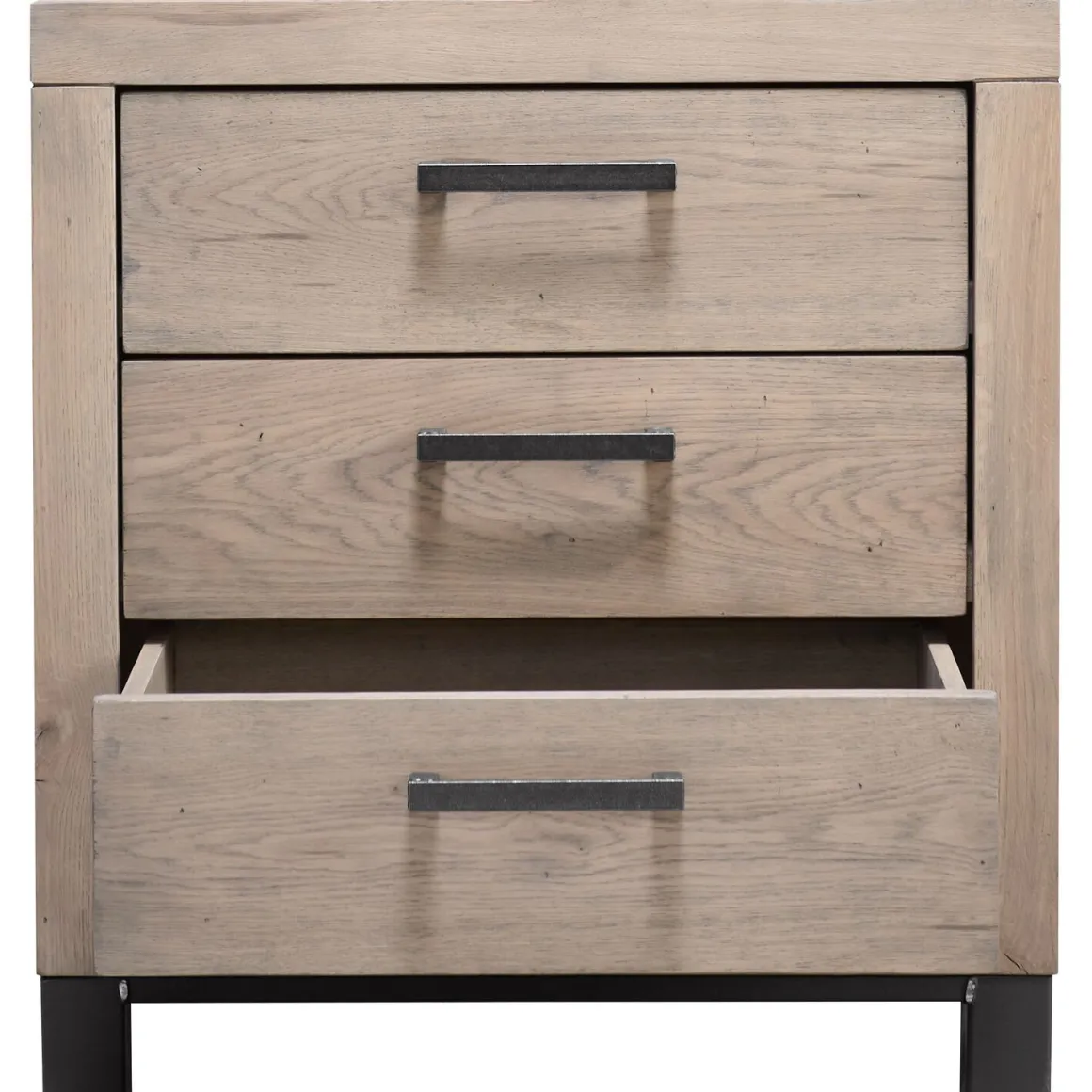 | Uitvoering | Uitgevoerd met 3 laden in grotendeels massief robuust eikenhout geborsteld in de kleur 38.5 moose, met zwart metalen handgrepen. |