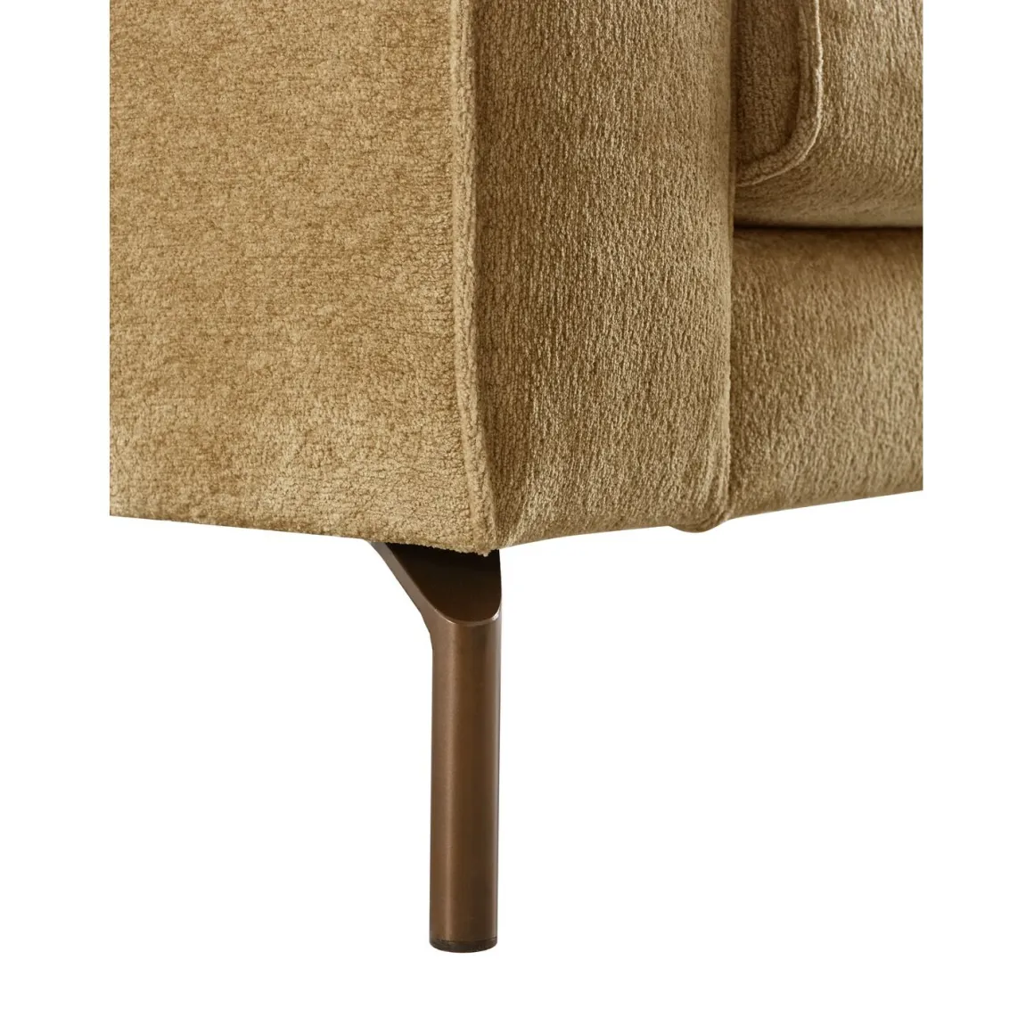 Loveseat Linoza heeft een moderne en uitnodigende uitstraling dankzij de royale vorm en het losse rugkussen. De loveseat is uitgevoerd in een bouclé weefstof in een warmbeige tint. De fijne structuur voelt zacht aan en geeft het meubel een luxe uitstraling. Afhankelijk van de lichtinval ontstaat een subtiele gouden gloed, wat de loveseat een chique en sfeervol accent geeft. De metalen poten in warme bruintint maken het ontwerp stijlvol en eigentijds.