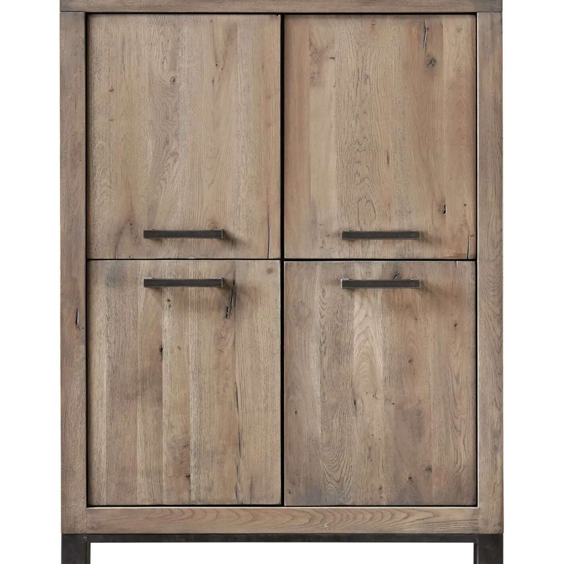 Deze robuuste opbergkast Hevano is gemaakt van eikenhout met een grof gelast stalen onderstel. Eikenhout kenmerkt zich door de fijne nerf, vlamtekening en de wisselende kleurschakering. Elke boom heeft een eigen uitstraling door de groei en weersinvloeden. Structuur, nerfschakering, windbarstjes, haarscheurtjes en de aanwezigheid van grote en kleine knoesten getuigen van jarenlange groei en maken het hout van de boom authentiek.