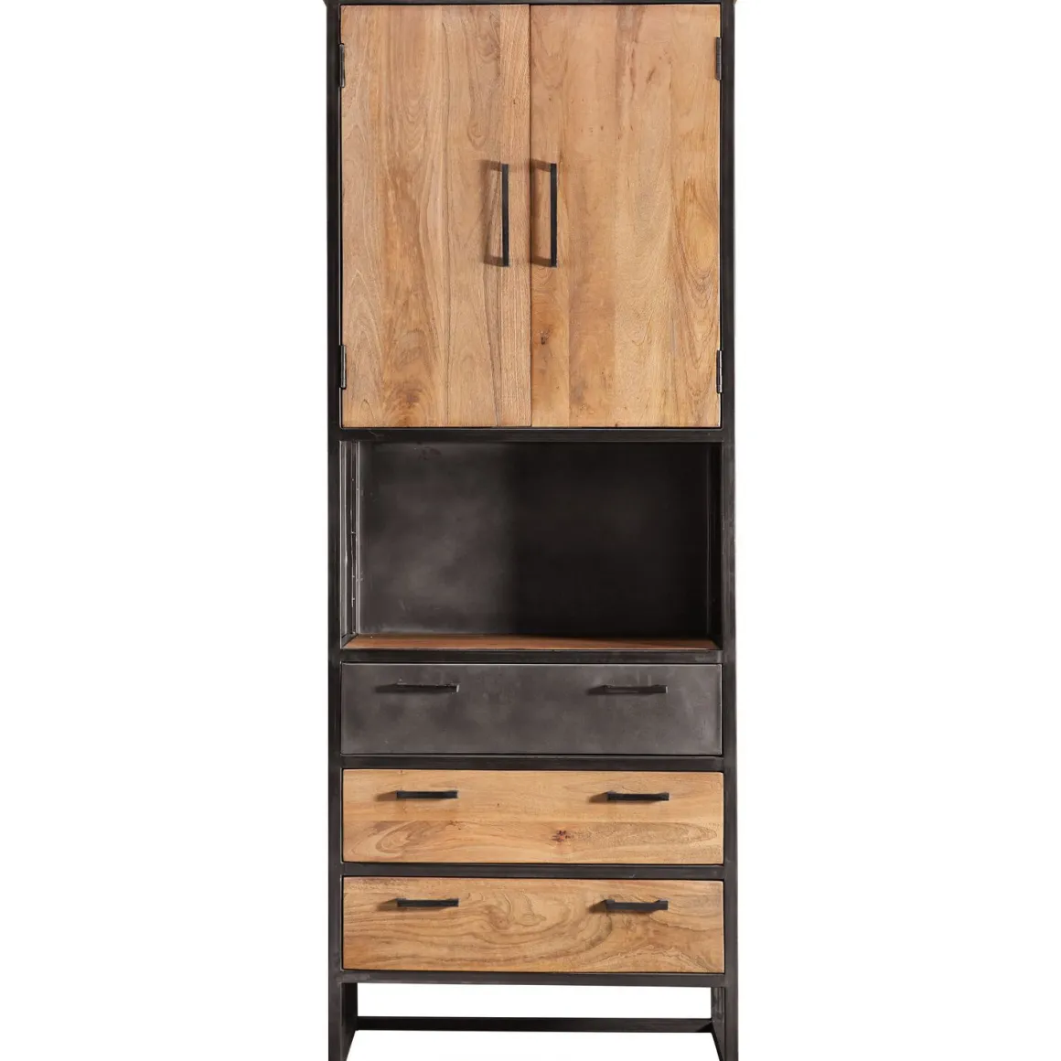 | Uitvoering | Uitgevoerd in mangohout natural met antique metalen frame, met 2 deuren, 3 laden en 1 open vak. |