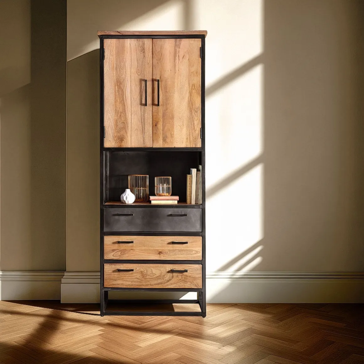De kast heeft 2 deuren, 3 lades en 1 open vak. Het open vak heeft een hoogte van 39 cm en een breedte van 70 cm. Deze kast is ideaal om je leuke accessoires of boeken een plekje in het zicht te geven, maar ook om spullen ongezien in op te bergen. Met een hoogte van 202 cm en een breedte van 76 cm, biedt deze kast veel opbergruimte. Achter de deuren bevindt zich een vaste legplank.