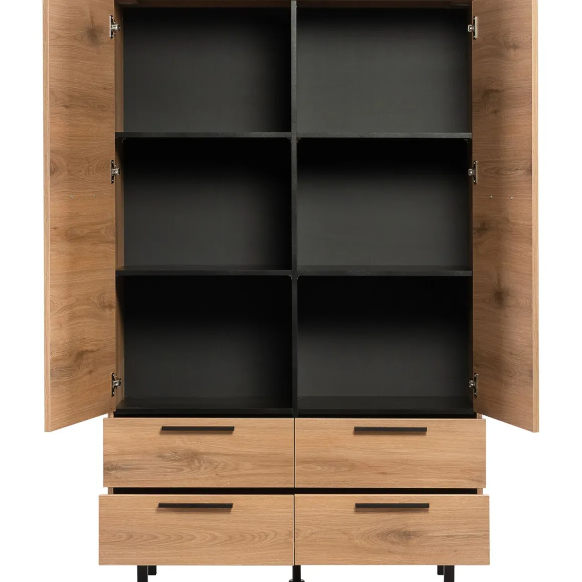| Uitvoering | Uitgevoerd in melamine Natural Canella Oak decor met zwart metalen handgrepen en poten met 2 deuren en 4 laden. |