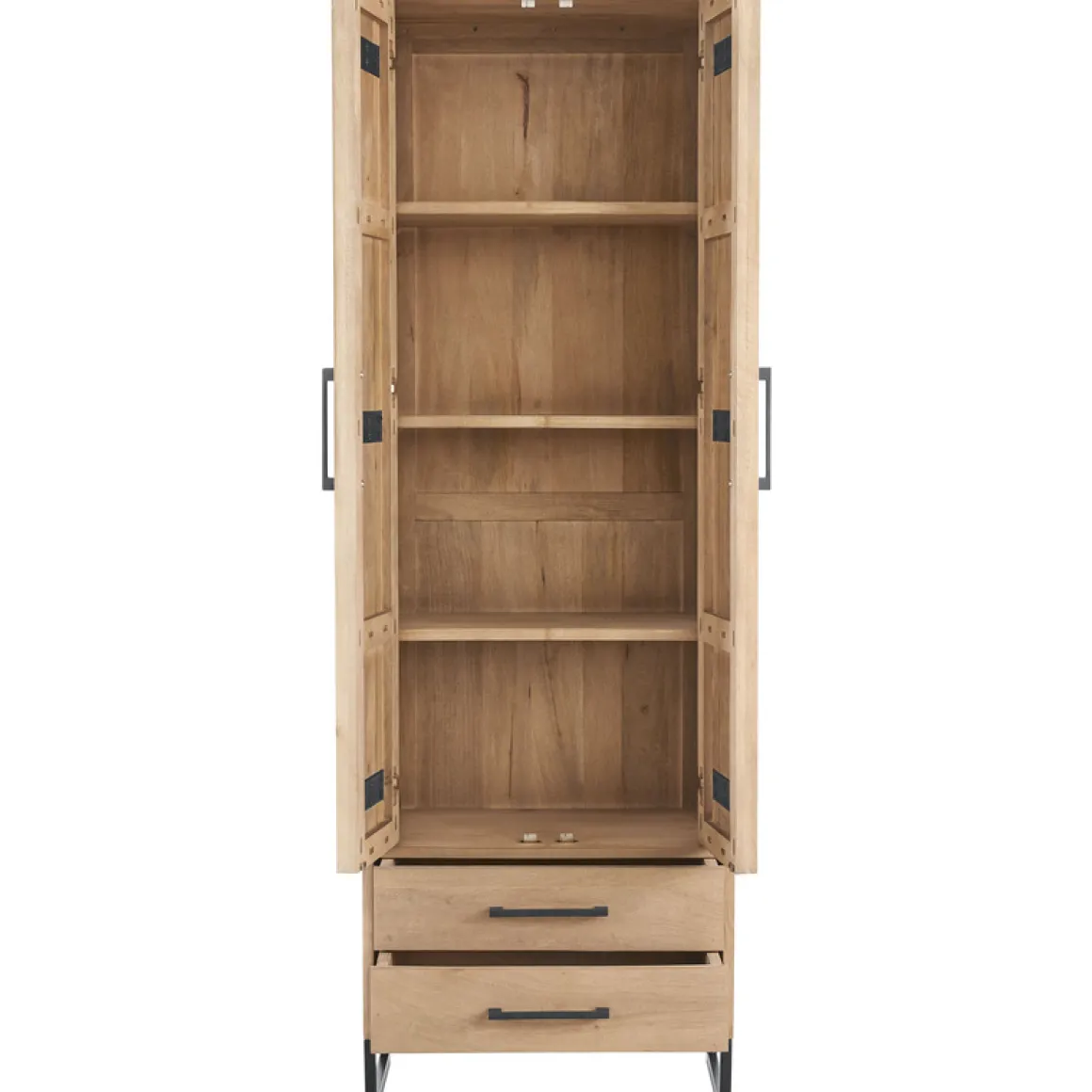 | Uitvoering | Uitgevoerd in gezandstraald mangohout in de kleur warm naturel en een zwart metalen frame, met 2 deuren en 2 laden. |