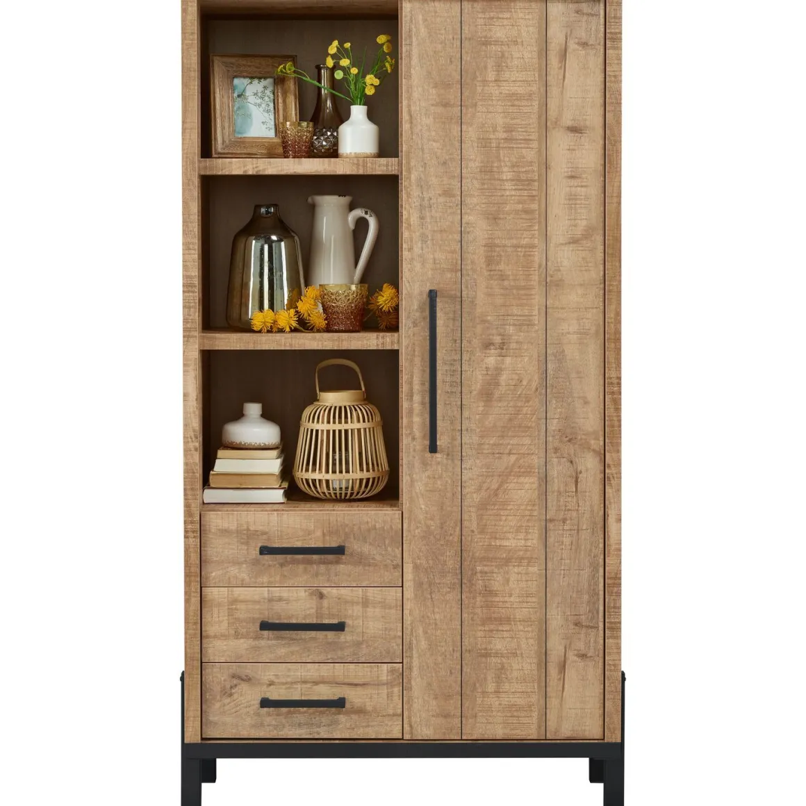 | Uitvoering | Uitgevoerd in melamine met mango decor in combinatie met zwart metalen frame, met 1 deur, 3 laden en 3 open vakken. |