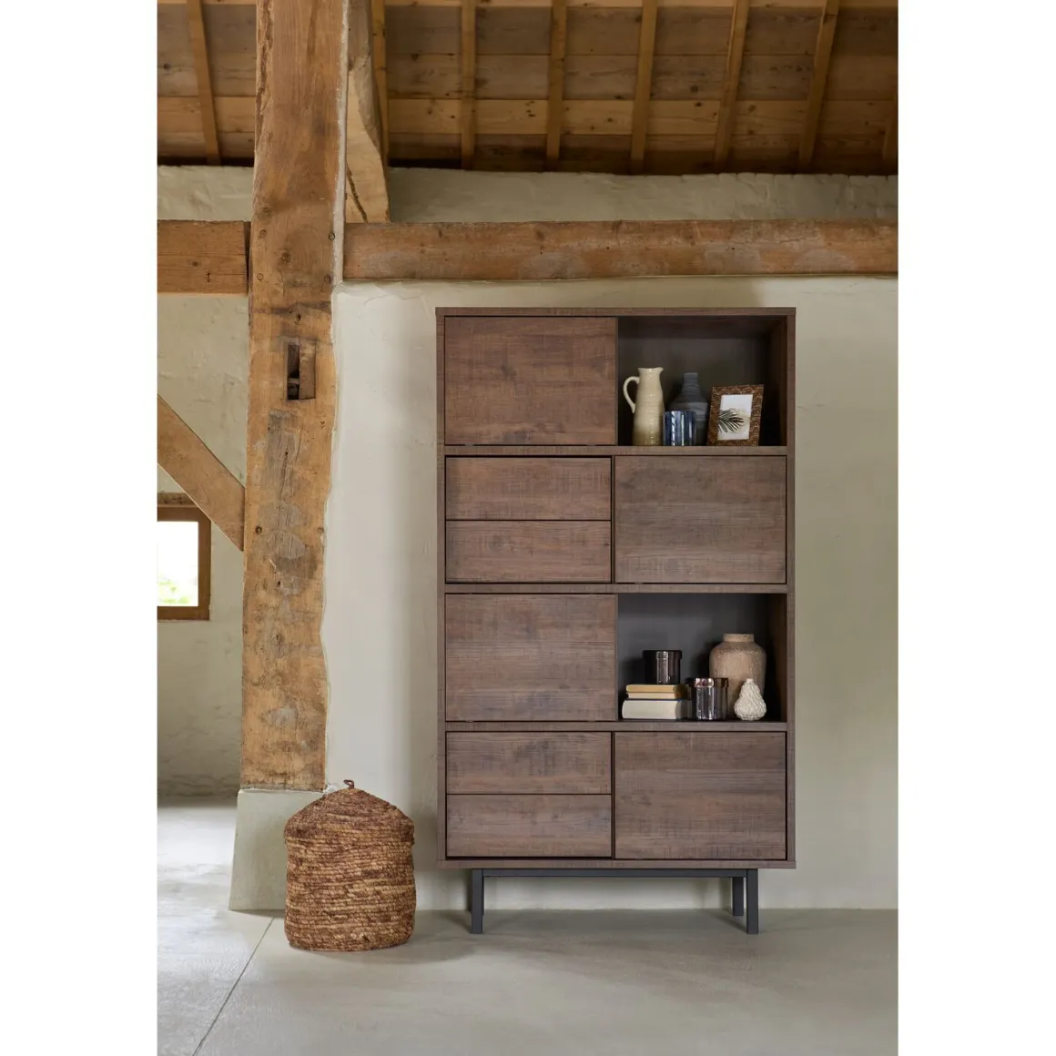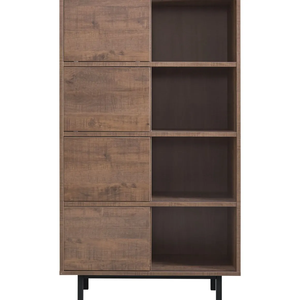 | Uitvoering | Uitgevoerd in melamine met dark mango decor in combinatie met zwart metalen poten met 4 schuifdeuren en 4 laden en 2 open vakken. |
