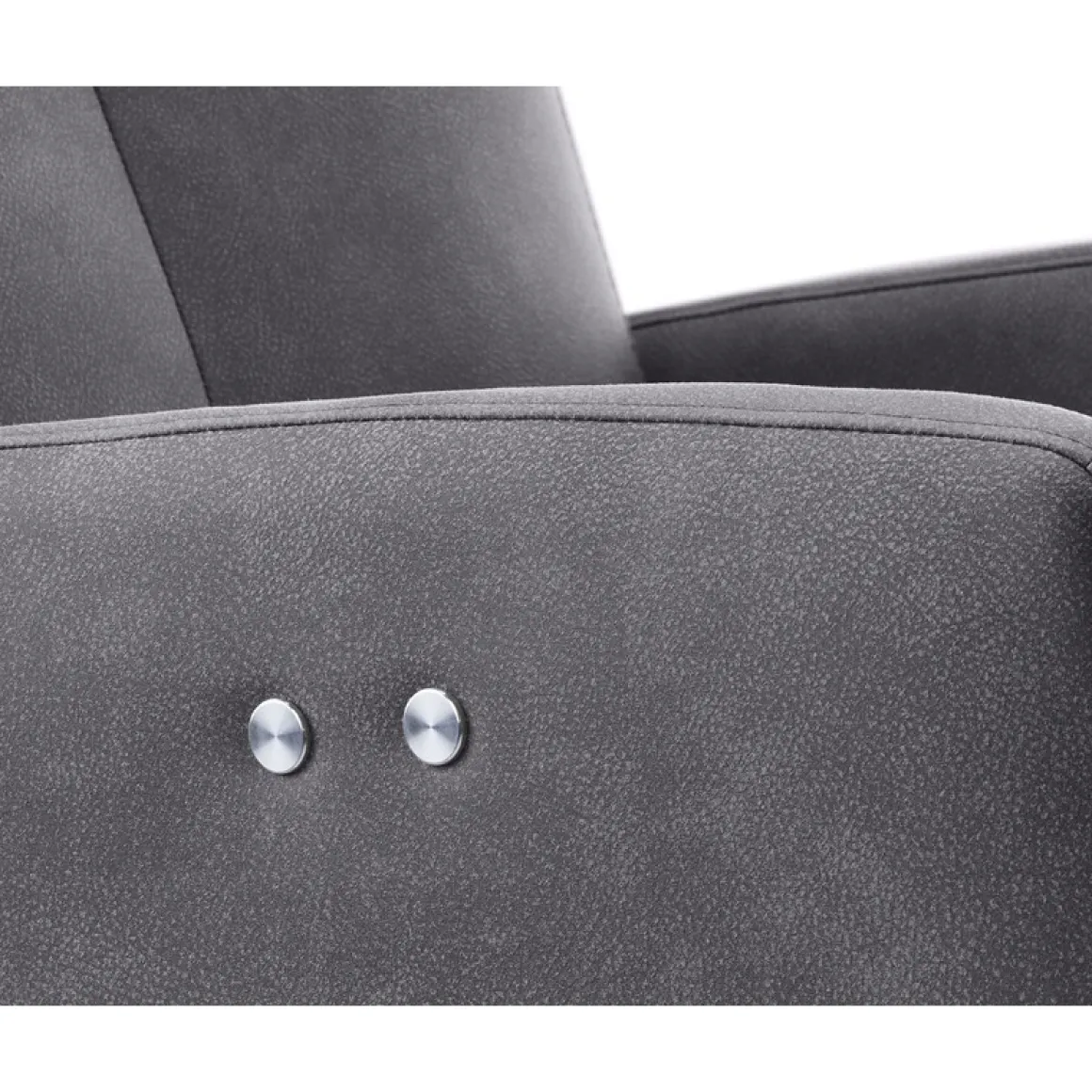 Relaxfauteuil Perfini is bekleed met een donkergrijze microvezelstof, deze heeft een licht gemeleerd patroon en voelt zacht en comfortabel aan. De stof is onderhoudsvriendelijk. Sierstiksels in de rugleuning zorgen samen met de stijlvolle armleuningen voor een elegante belijning.