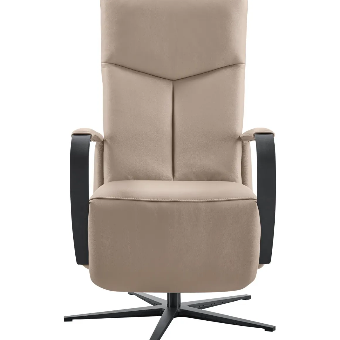De relaxfauteuil Seduto heeft een moderne en stijlvolle uitstraling. Deze uitvoering is bekleed met leder in een natuurlijke beigekleur met een warme uitstraling. Het leder voelt soepel en comfortabel aan en heeft een subtiele nerf voor een luxe, rustige look. De kleur laat zich makkelijk combineren met verschillende woonstijlen. Het Y-vormige stiksel in de rug en de metalen armleuningen met lederen sleeve zorgen voor een eigentijdse uitstraling. De zwarte metalen 5-teens voet geeft de fauteuil een moderne basis.