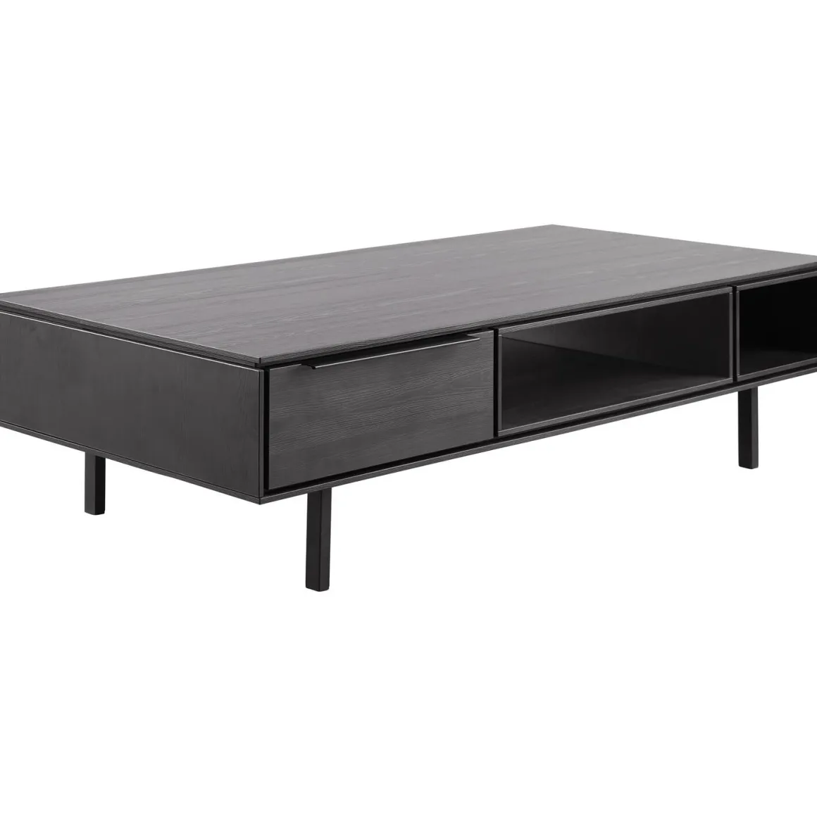 Met deze salontafel haal je een echte eyecatcher in huis. Het zwarte melamine, gecombineerd met de slanke, zwart metalen pootjes en handgrepen geven de tafel een moderne uitstraling.